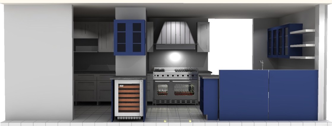 The enlarged kitchen also received fully custom two-toned cabinetry featuring the timeless combination of white and navy alongside quartz countertops, a porcelain subway tile backsplash, and the addition of a wine fridge to an immovable column.
