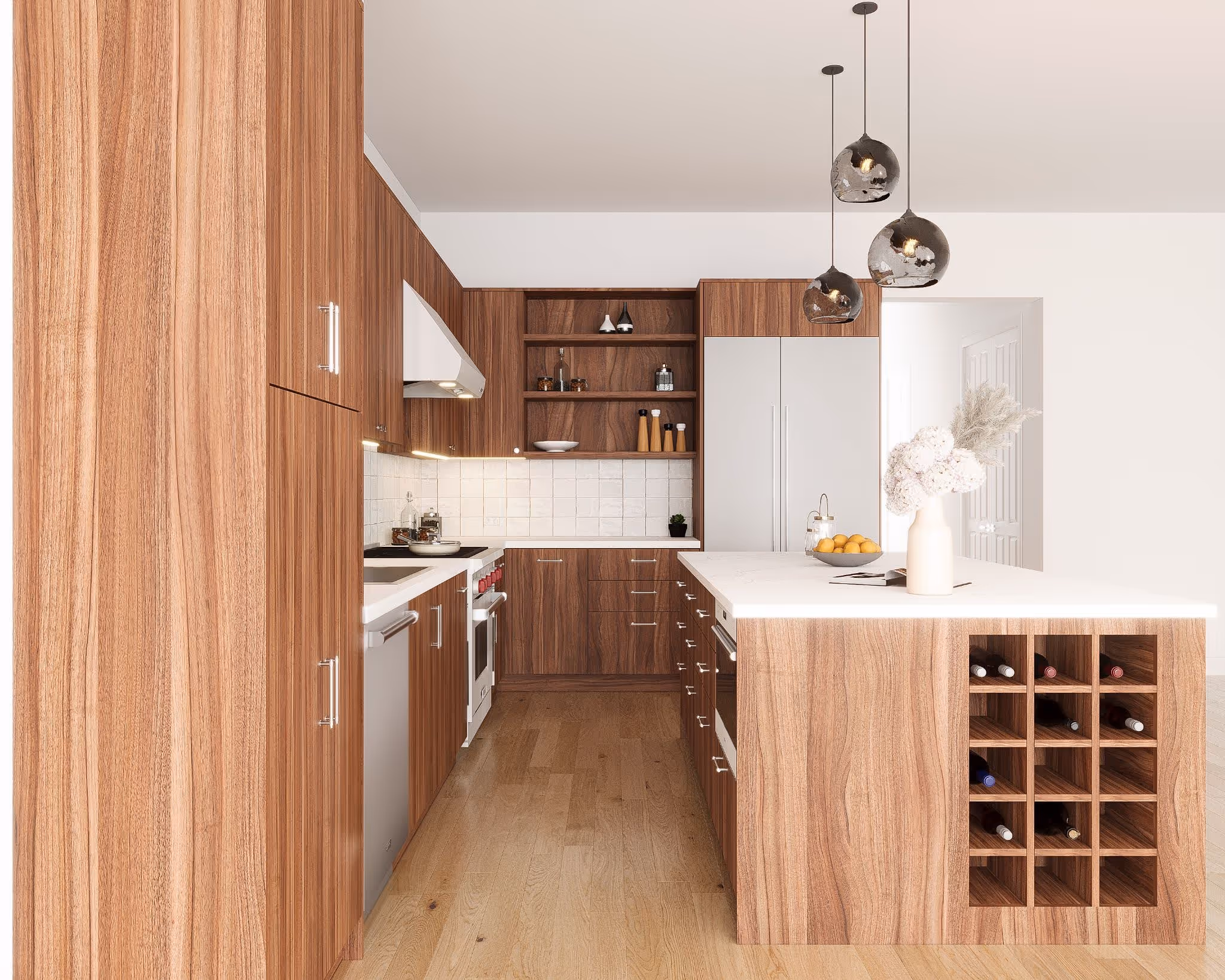 After materials have been sourced, we create life-like digital renderings of how the renovated home will appear. This includes every aspect of the design, from flooring to fixtures, even showing how renovated rooms will look under different lighting settings. These high-end renderings provide a visual accompaniment to the blueprint that guides construction and helps clients tweak final design decisions like paint color or fixture height. This kitchen render is from our stunning Tribeca Co-Op Loft Renovation at 335 Greenwich St. See the completed kitchen directly below.