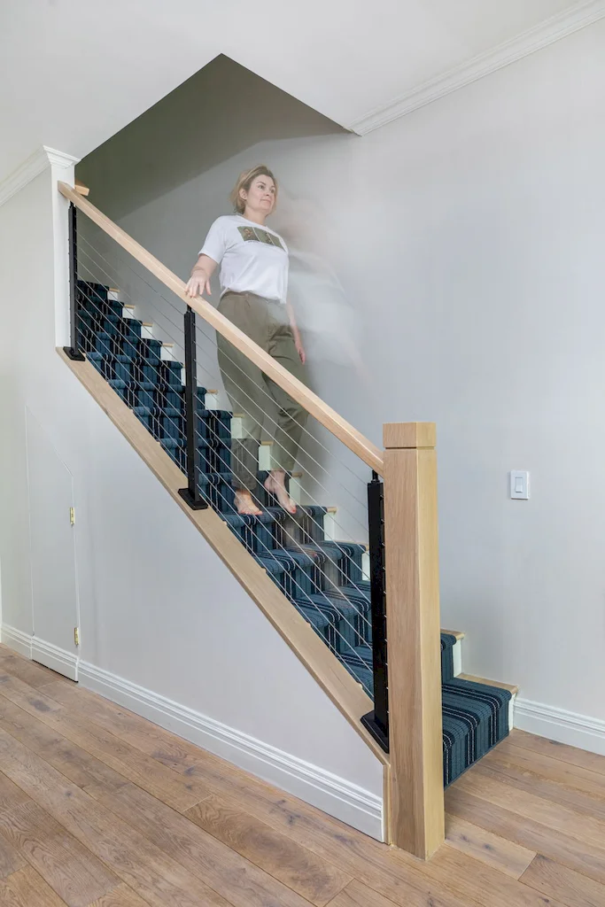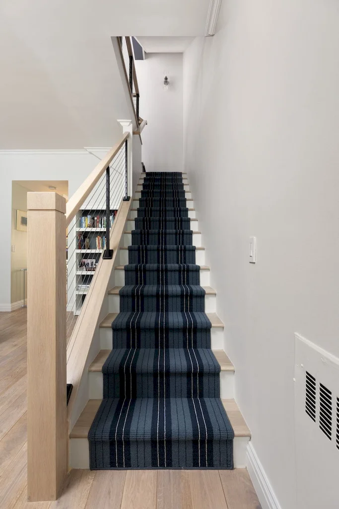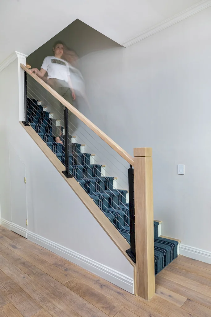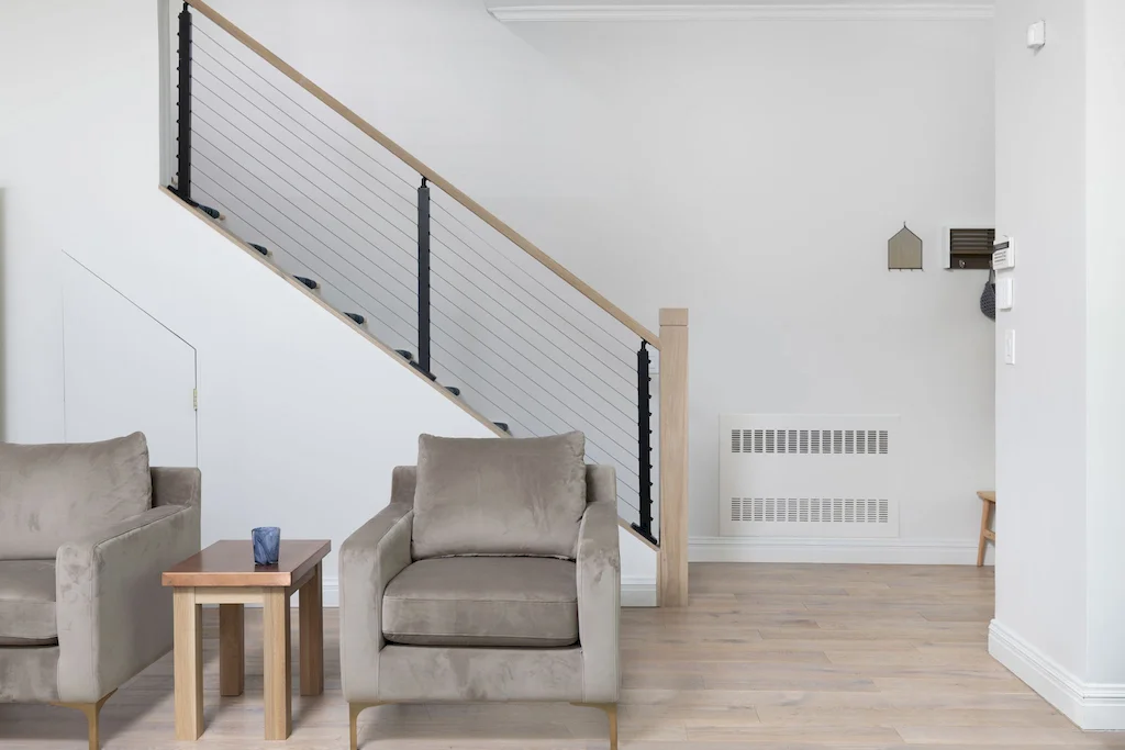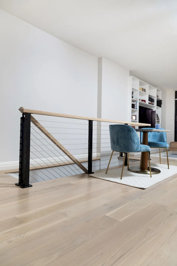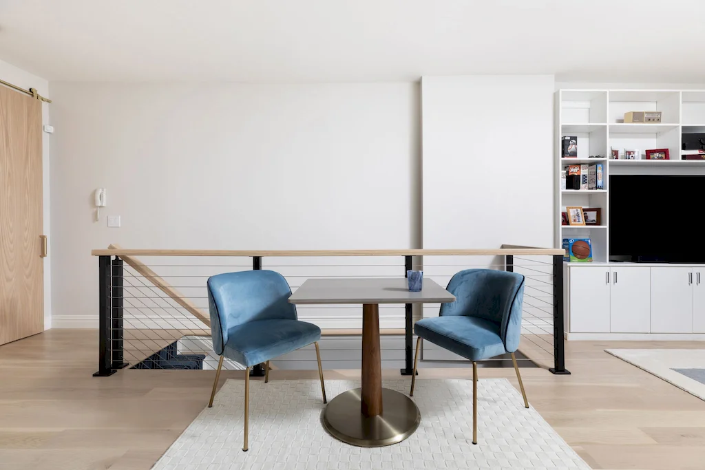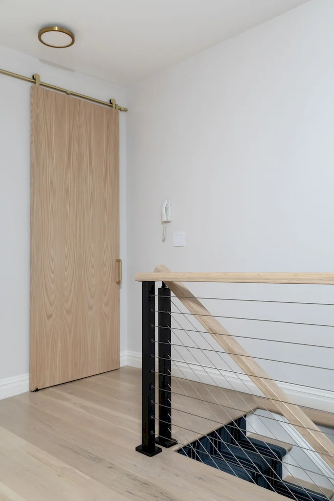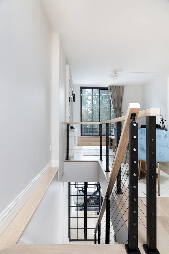 The focal point of this Lower Manhattan renovation is the new interior staircase, bridging all three levels and redefining the home’s flow. Offering more than connectivity, the staircase became a bold architectural feature, anchoring every level of interior with clean-lined railings and contemporary detail.
