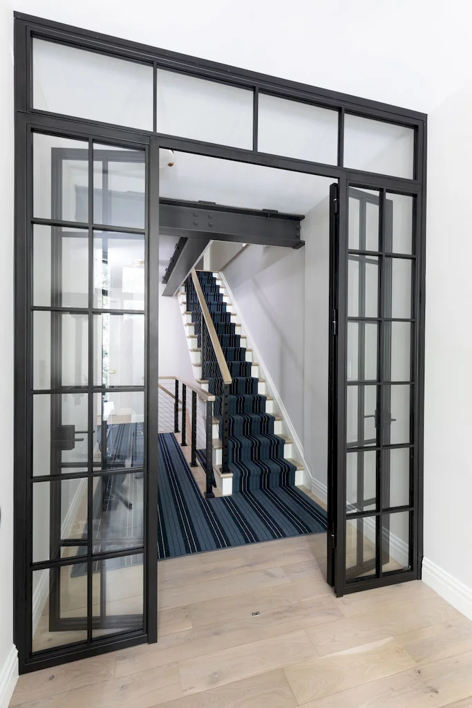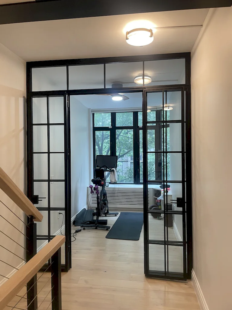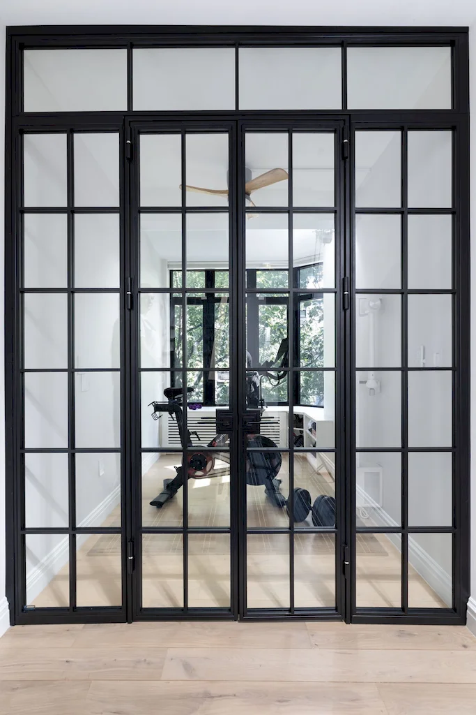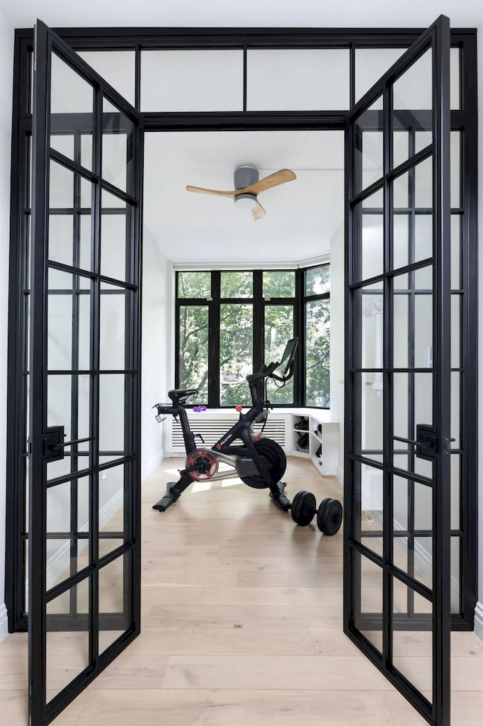 This structural layout adjustment also allowed to transform what was once a small bay window into a multi-purpose office/gym, enclosed with a custom iron-and-glass partition. This clever detail not only maximized square footage but also introduced a striking design that maintains natural light while still providing separation. Fitness and focus, what a combination.