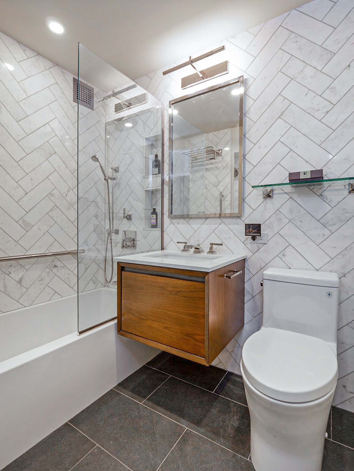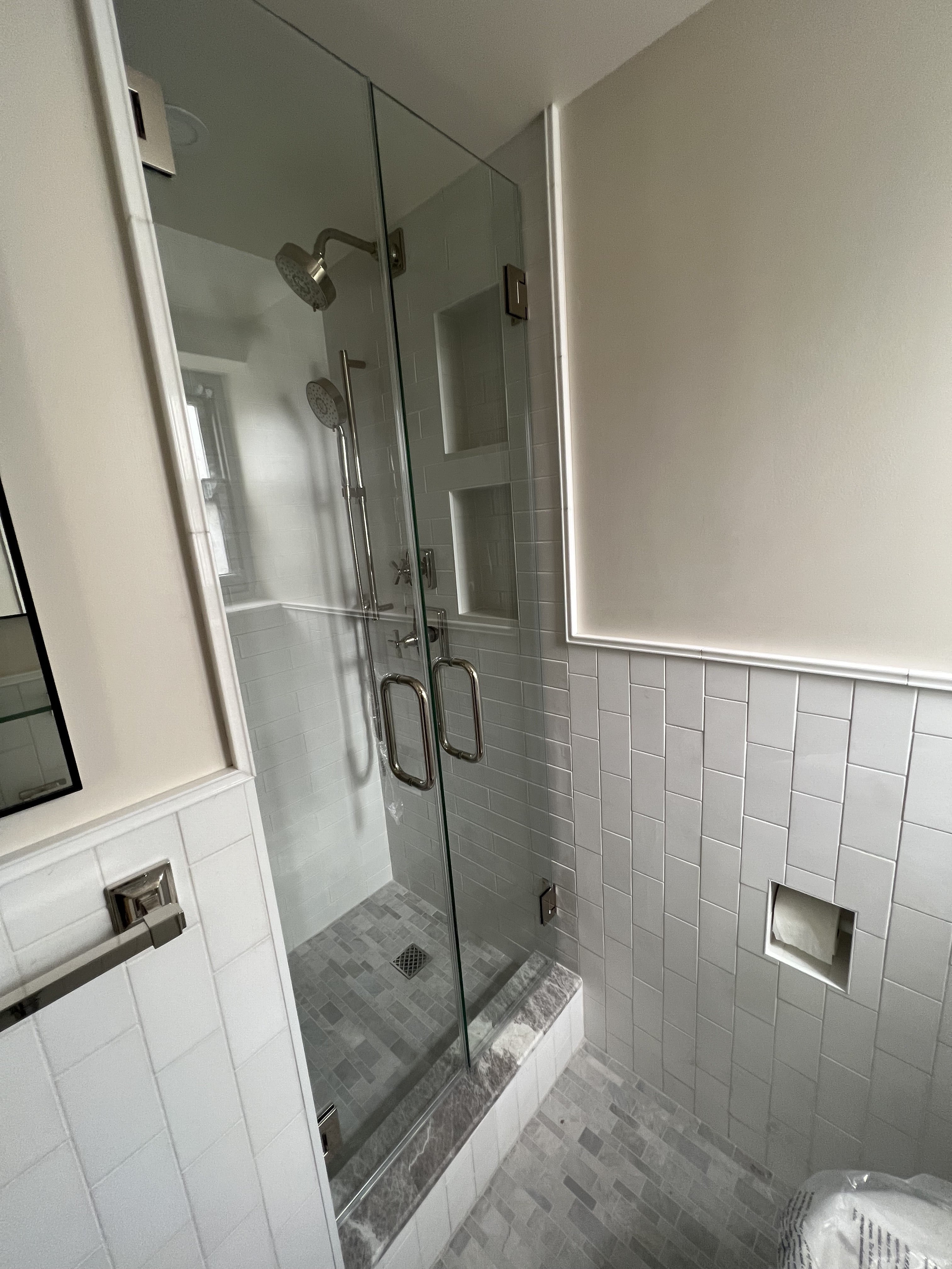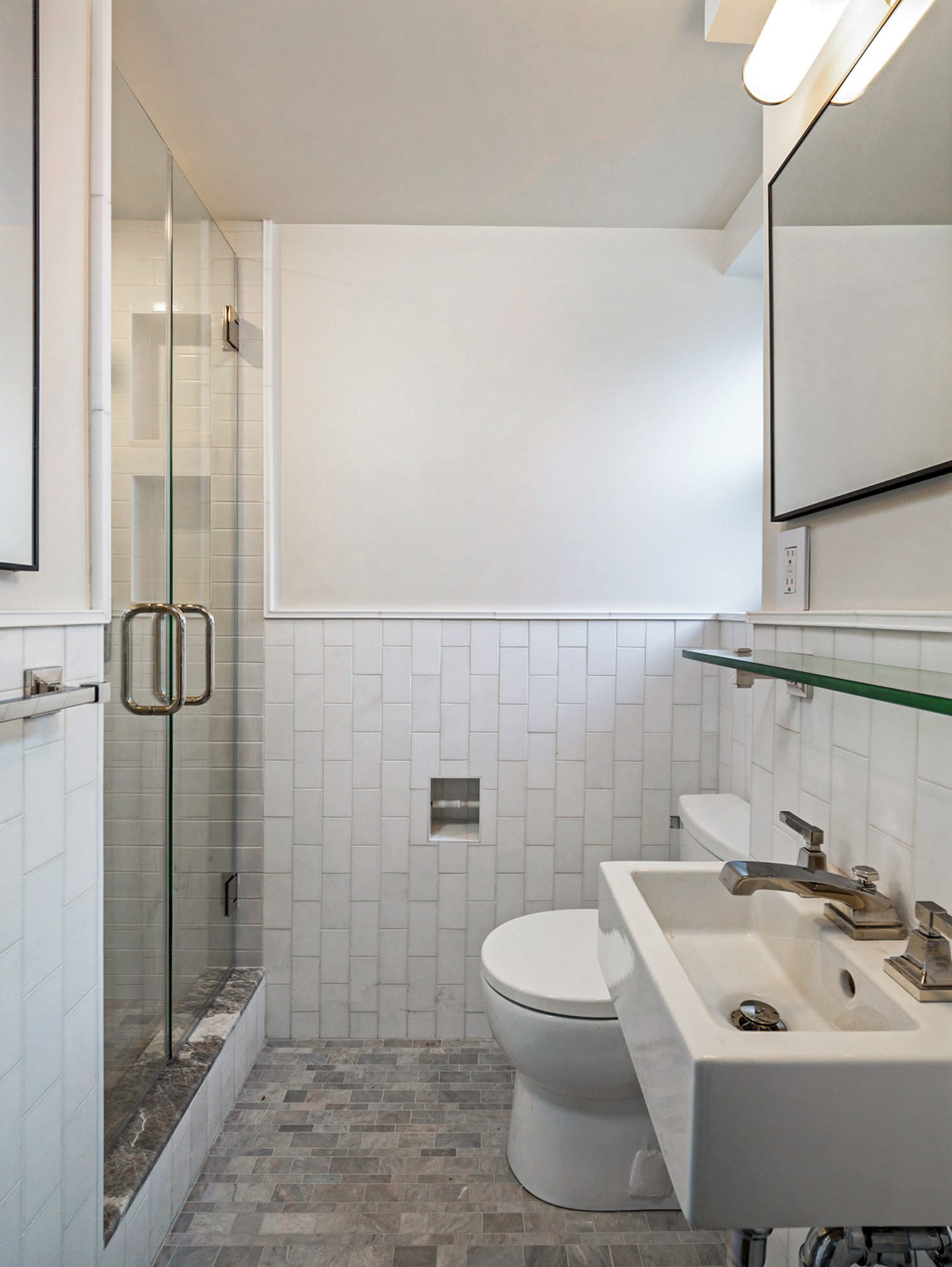 When renovating the bedrooms of 235 Adams, each required a different approach. For the primary bedroom, our client hoped to have more space in the attached ensuite bath. We recommended removing the closet in the adjoined room to provide more square footage, allowing us to reconfigure the space and create a much larger walk-in shower with double glass shower doors. The contemporary but classic space is complemented by basketweave Nemo Ice Grey Honed mesh-mounted mosaic marble floor tiles. We also replaced bulky old radiator covers with much slimmer built-ins that provide less obstruction and easier accessibility.