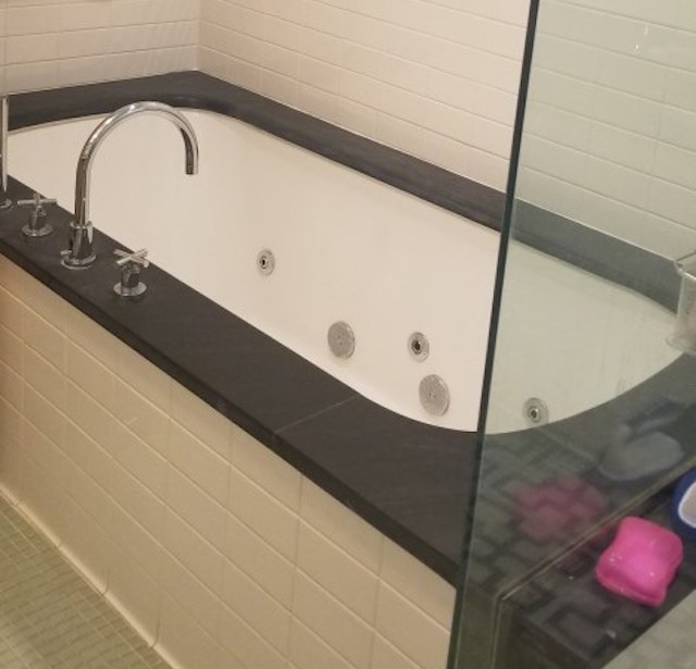 Learn the lingo: an X-piece bathroom refers to the amount of plumbing points, so a 3-piece is typically a toilet, vanity, and one shower/tub/combo; a 4-piece is a toilet, vanity, separate shower, and separate tub; and a 5-piece is a toilet, shower, tub, and dual vanity.