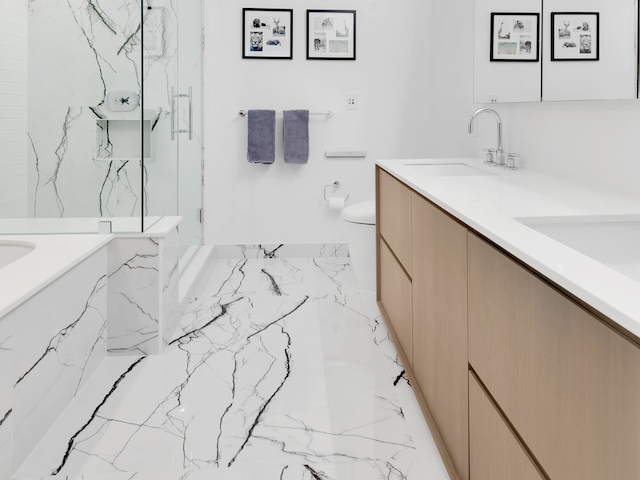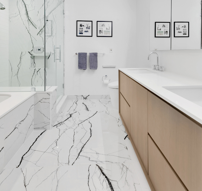 In the master bathroom, a 5-piece, the design aesthetic took on a more decidedly modern approach. The client wanted to avoid grout, so we chose really large porcelain tiles that resemble slabs of marble. The large tiles eliminate grout for a sleek look, while the porcelain offers the luxe look of marble without the heavy-duty upkeep. To break up the veining a bit, a section of the shower wall was covered with subway tiles for clean contrast. We continued the sleek and modern look in the powder room, with natural stone onyx floor tiles bringing in a touch of visual interest.