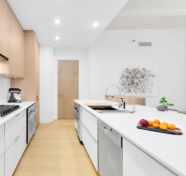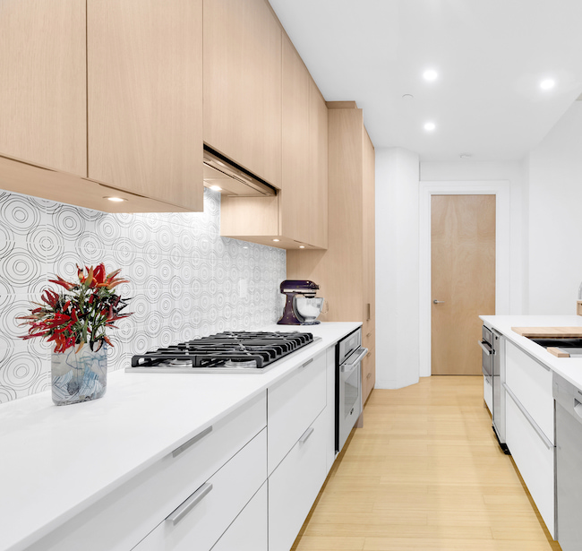 It quickly became apparent that midcentury modern was the prevailing aesthetic for this Brooklyn loft kitchen renovation. Some elements are more straightforwardly modern, such as the functional modular four-in-one kitchen sink that’s also a cutting board, vegetable prep station, and colander, while the patterned ceramic tiles are a classic midcentury modern motif. Custom cabinets take advantage of the naturally tall loft ceilings, with pure white Caesarstone quartz countertops to balance the design.