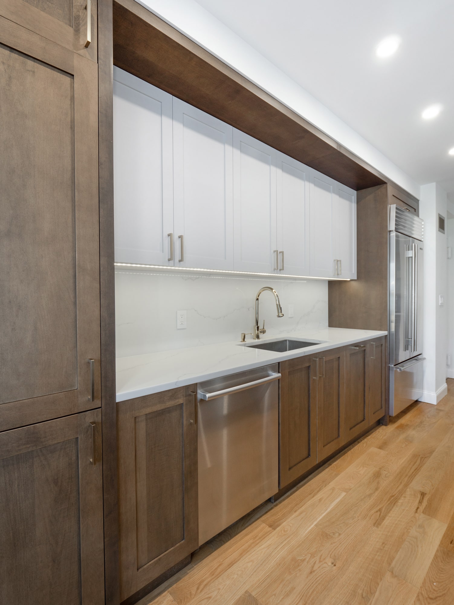There are various custom elements that make this particular NYC kitchen renovation stand-out. While the majority of the apartment has herringbone wood flooring, determination was made that having herringbone flooring in the kitchen would have been busy on the eye. Instead, we went with straight planks for the kitchen and blended from the living room with a custom wood flooring design. Additionally, there’s wood paneling lining the kitchen, accenting the off-white and chestnut cabinets with a touch of luxe. Finally, the quartz backsplash and countertop offer a nice and seamless touch to the overall modern design of condo kitchen remodel.