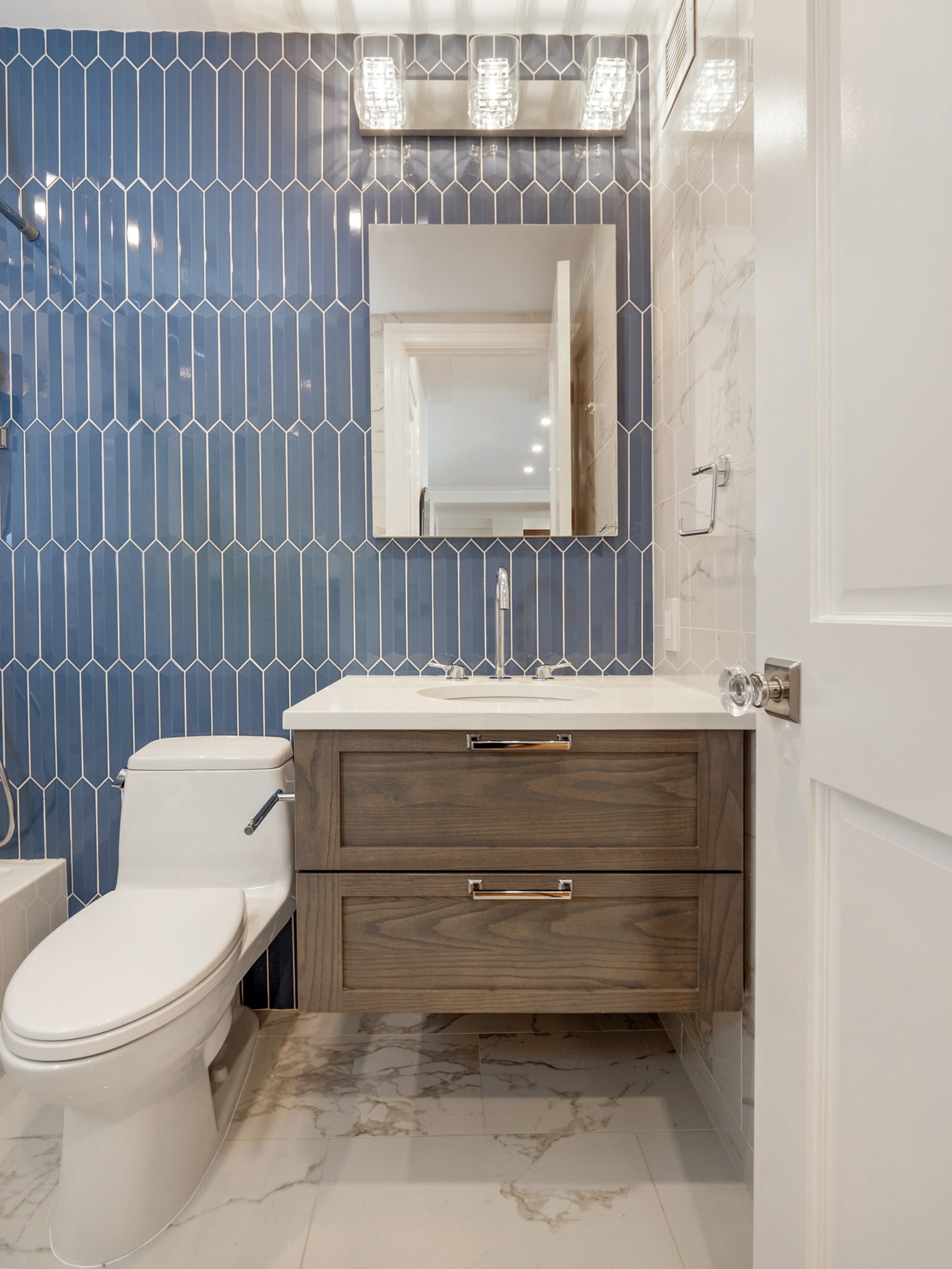 With the two bathroom remodels in this Manhattan apartment, our goal was to create similar but distinct designs between the two spaces, that still felt unique in their own right and blended with the rest of the home. The wood vanities incorporate the heavy wood tones from other rooms, while the strong accent tiles on the walls and big, bold marble floor tiling create elegant foundations for each space.