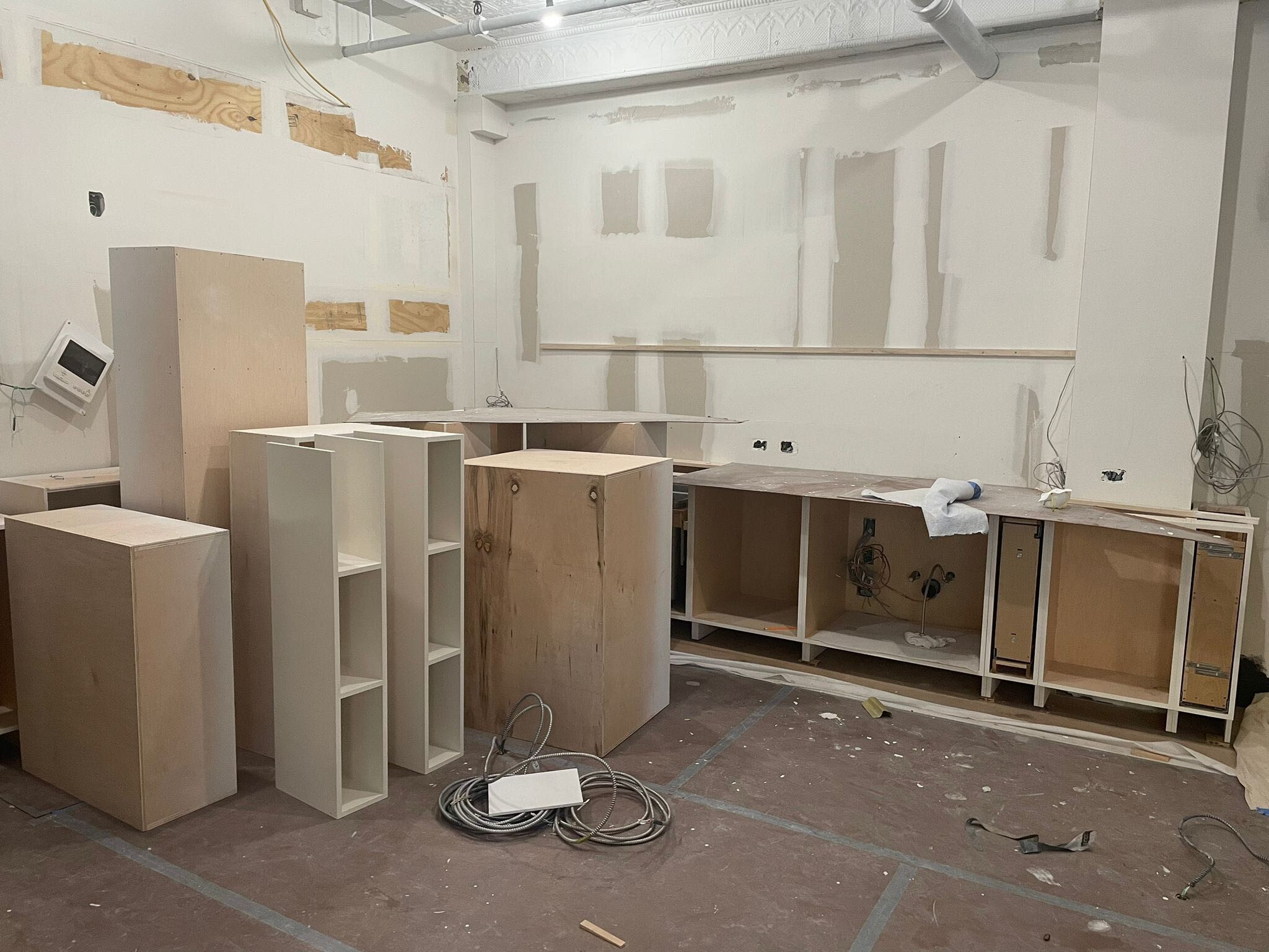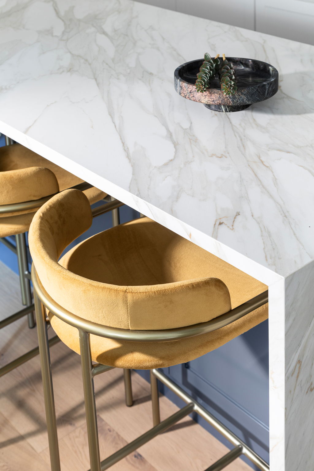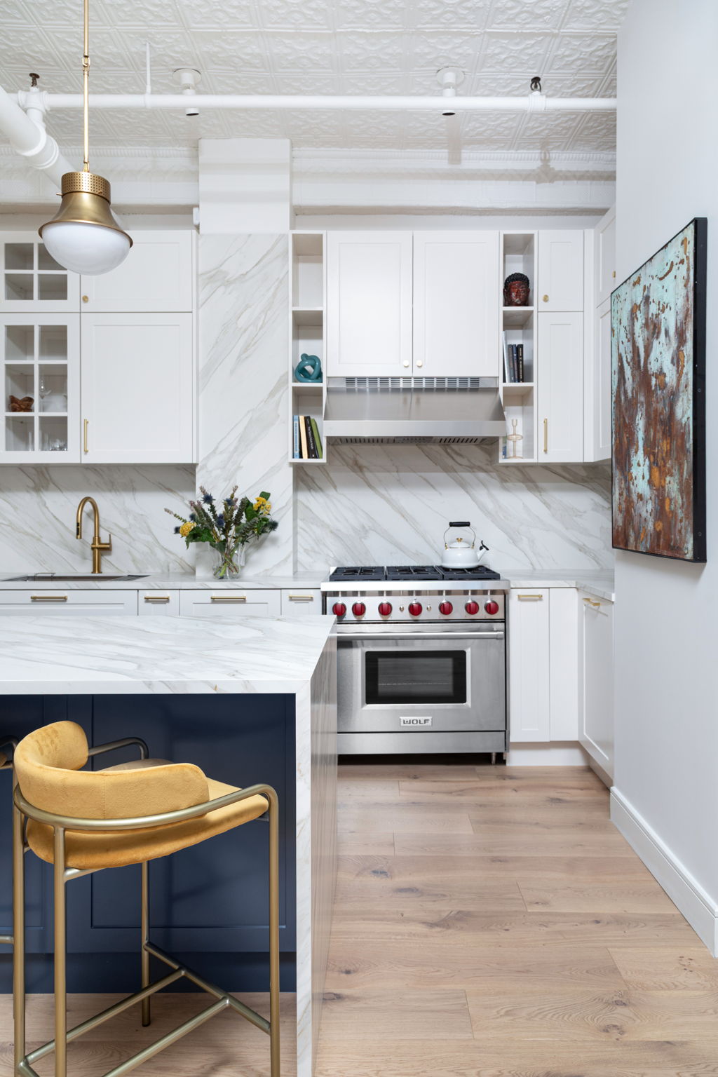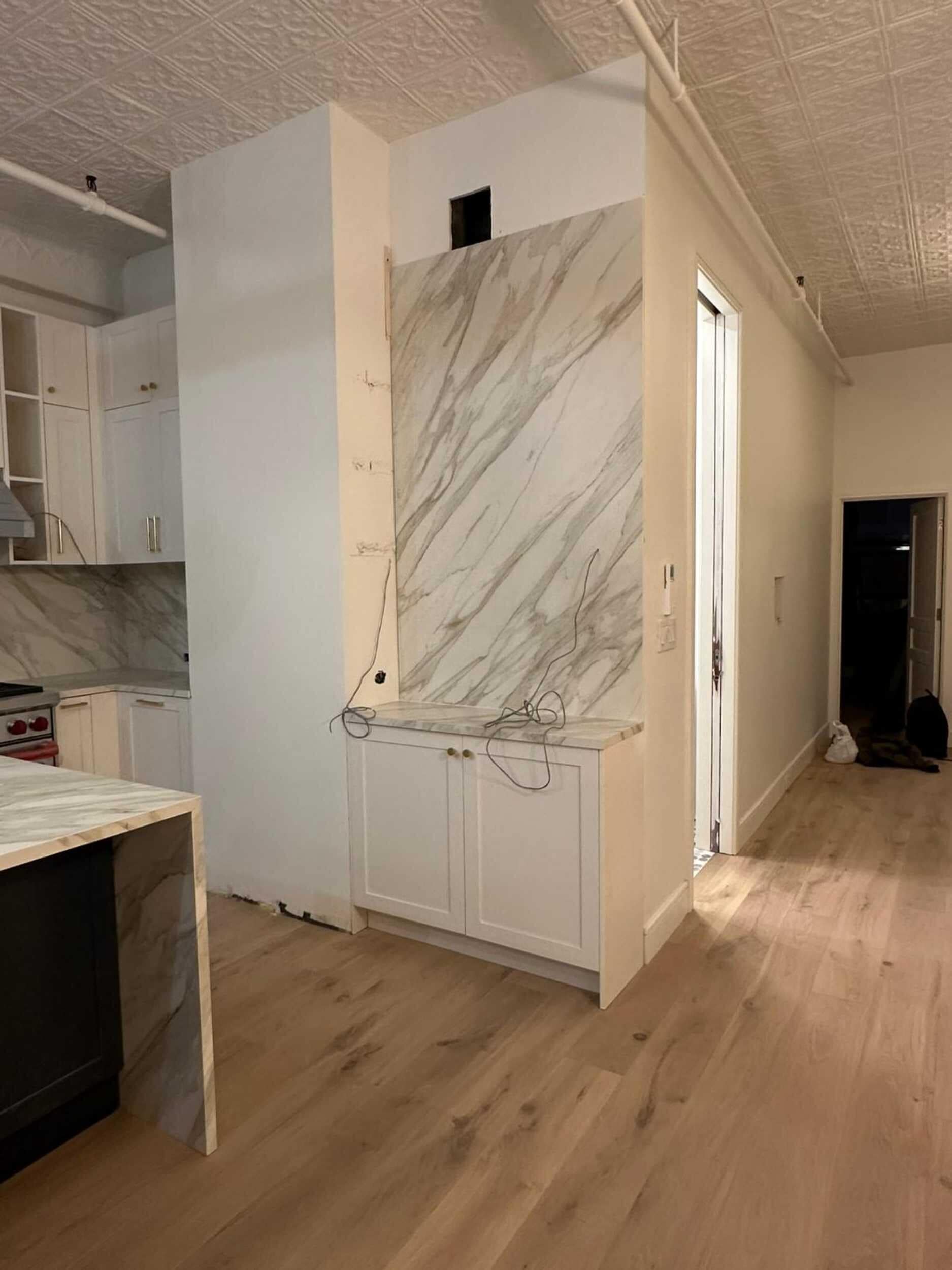 One significant challenge was installing the oversized Neolith Calacatta Gold Silk island slab, which was too large to fit in the building’s elevator. After extensive coordination and building approvals, we devised a solution that felt straight out of a Mission Impossible movie. We opened the elevator shaft on the second floor (while the elevator sat at the first), placed the slab on top of the elevator inside the shaft, then had contractors ride the elevator roof up to the fourth floor to safely receive and install—ensuring not a single detail was compromised. Tom Cruise could never.