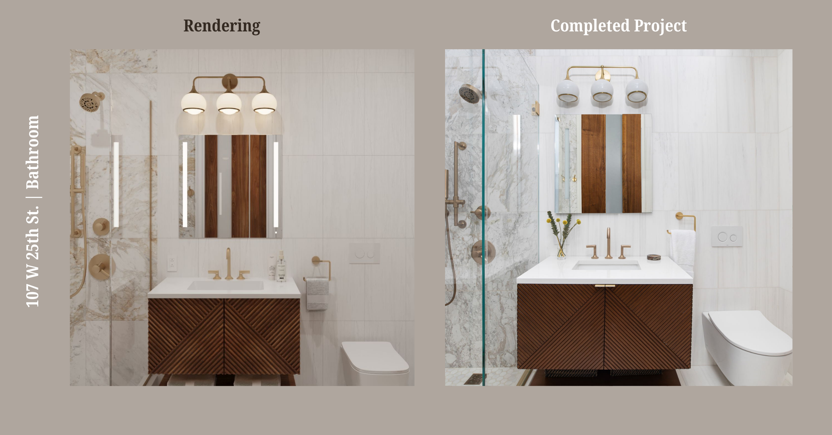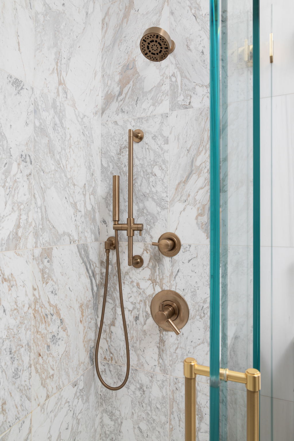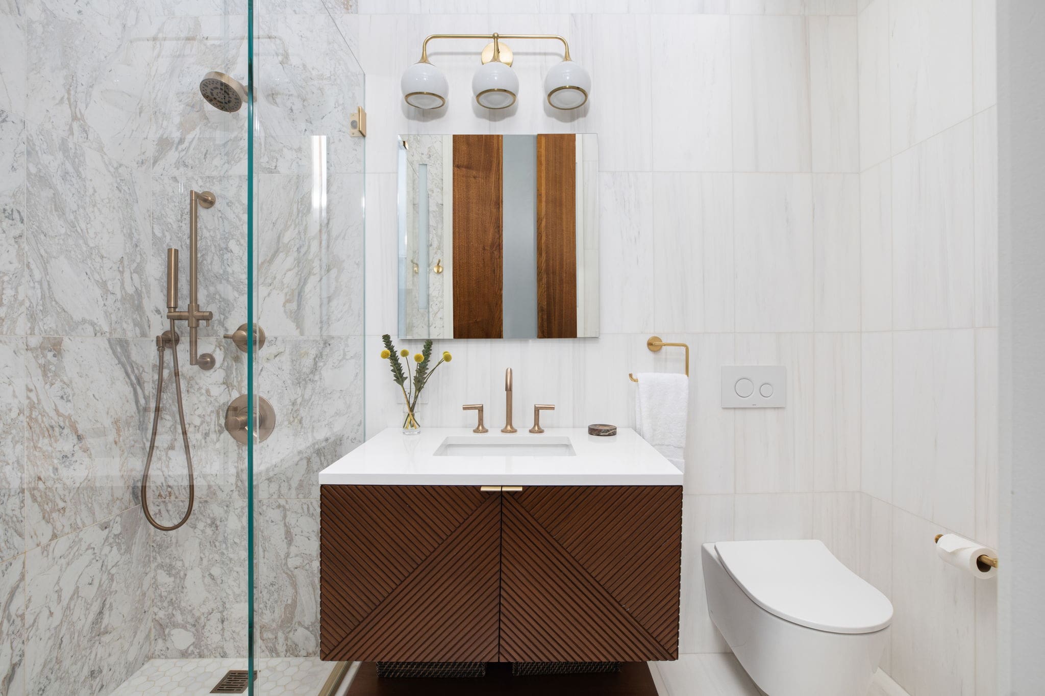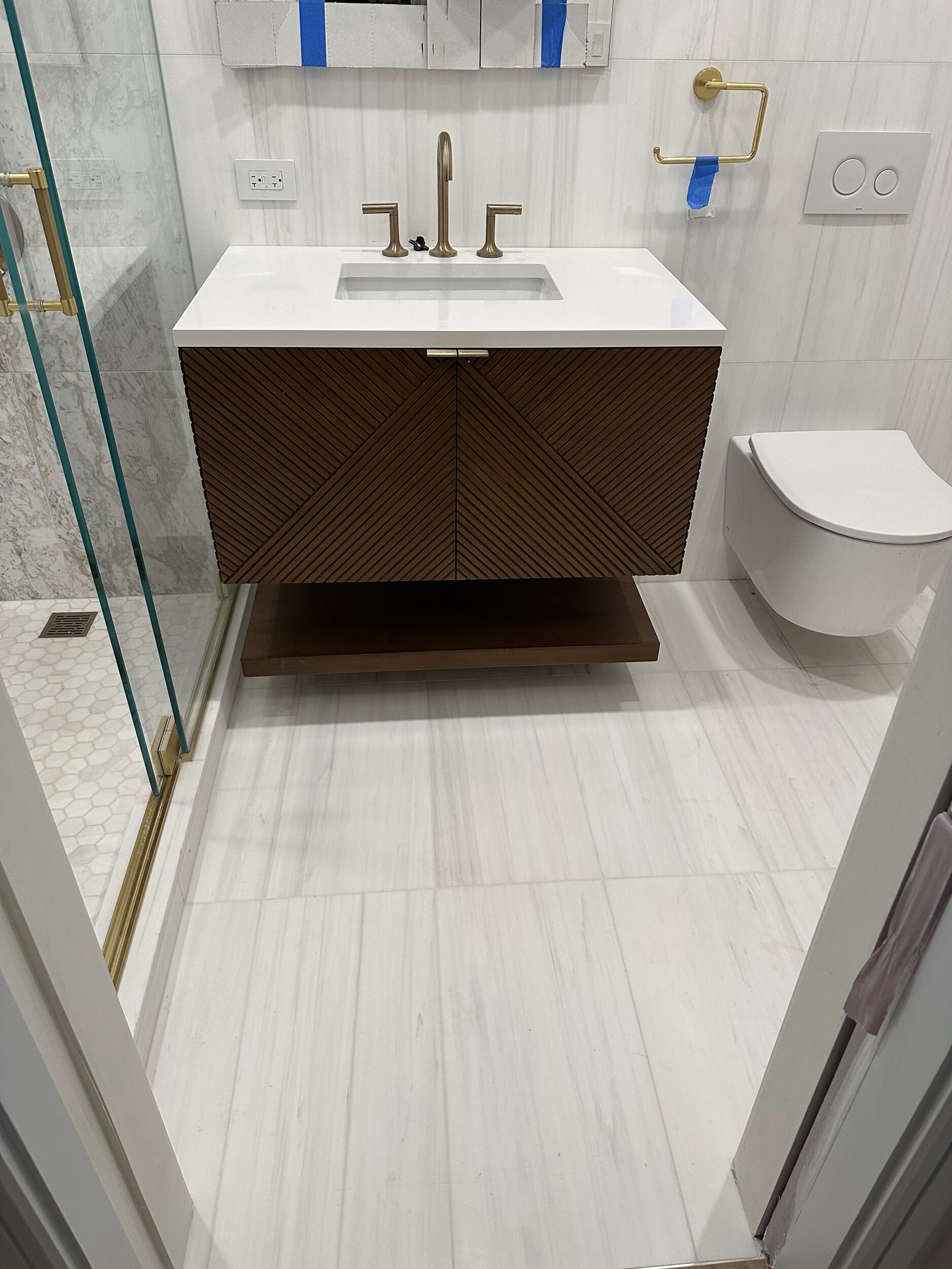 To free up valuable square footage, we coordinated with the building to shift the original plumbing risers behind the walls, improving flow while preserving the overall aesthetic.In the primary ensuite, a Brizo Odin widespread faucet pairs with Bianco Dolomiti tile across the floor and walls, while a honed Arabescato D’Oro marble elevates the shower with subtle contrast—creating a serene but statement-making retreat for the parents.