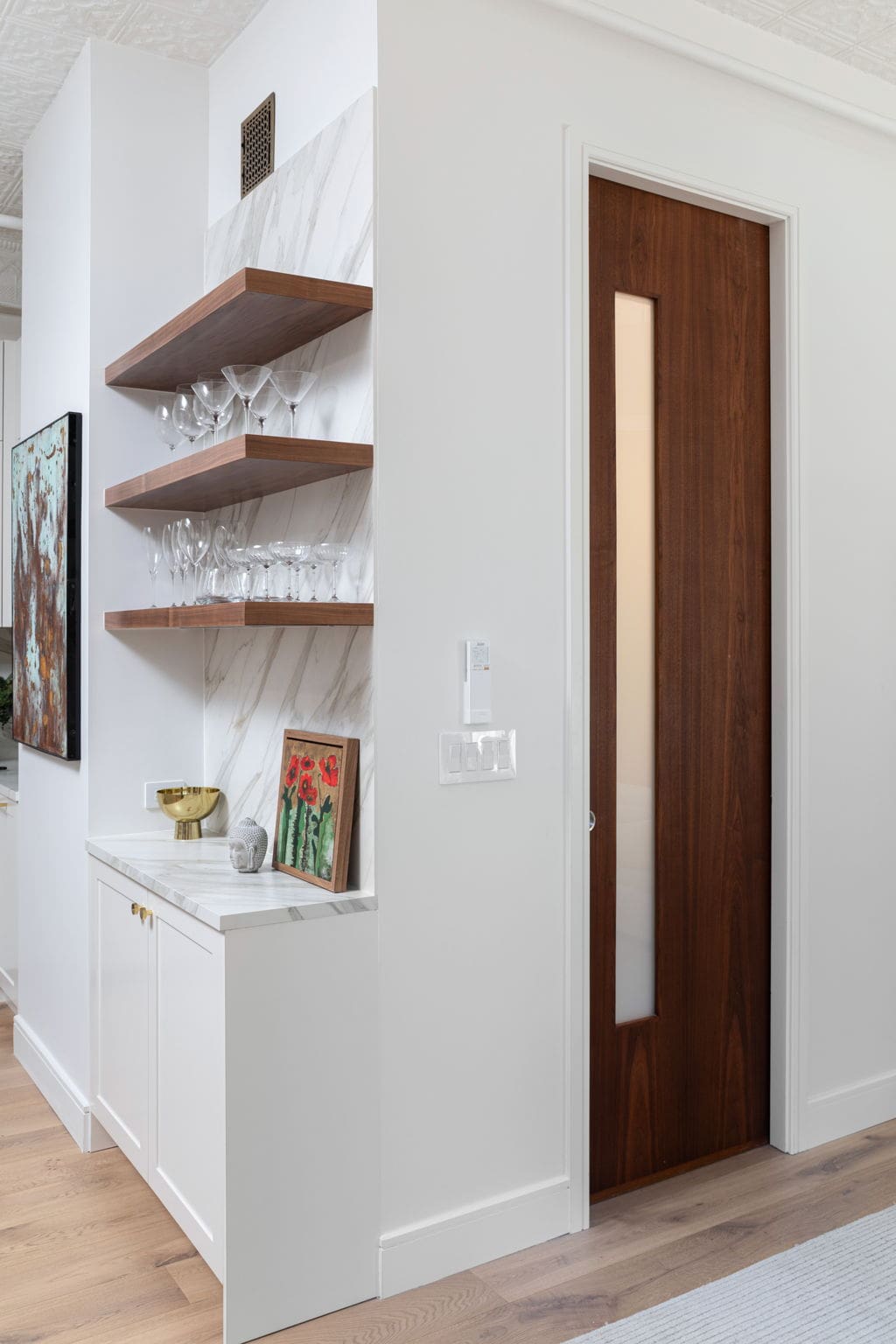 While the primary goal of this Chelsea condo renovation was to make the most of every square inch, the full gut remodel also created an opportunity to reimagine the kitchen. We introduced a new layout centered on functionality and flow, incorporating an appliance garage with pocket doors, two-tier cabinetry, a Magic Corner cabinet organizer, plus a mix of pull-outs and roll-outs to maximize storage. Open shelving balanced the space visually, while a concealed charging station kept surfaces free of clutter.