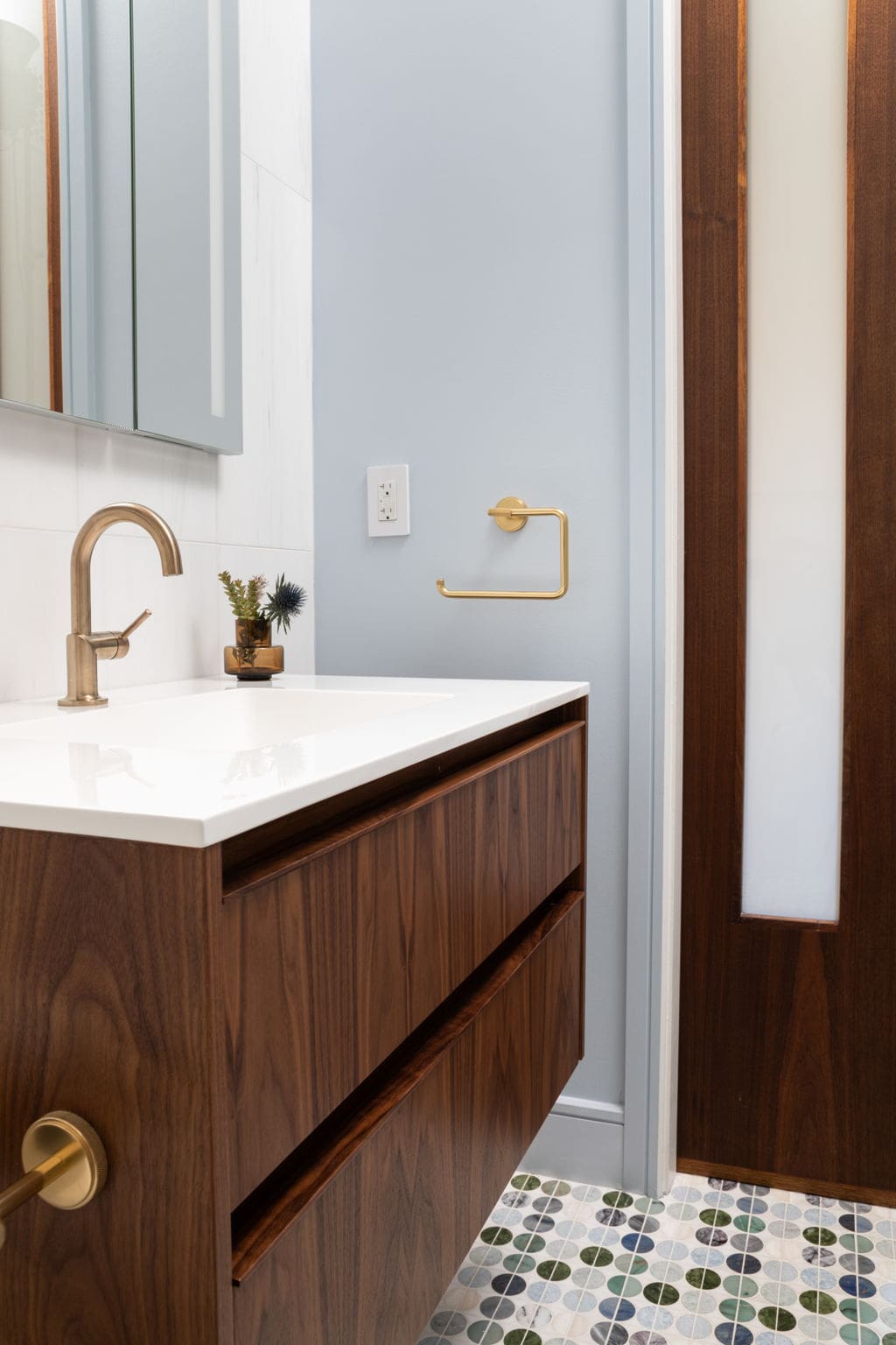 While adding the second bathroom was a huge help for their evolving family, there was still room to maximize the space further to accommodate growth. Enter—a full bathroom conversion. By splitting one large bathroom into two, we created a private ensuite for the parents and a secondary bath for the kids (or guests) that is accessible from the main living area. A strategic wall shift of about 10 inches gave us just enough wiggle room to fit a 34–36” vanity, standard toilet clearance, and a comfortable shower in each space.