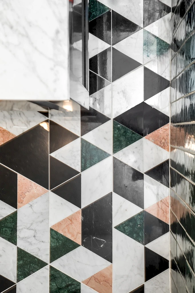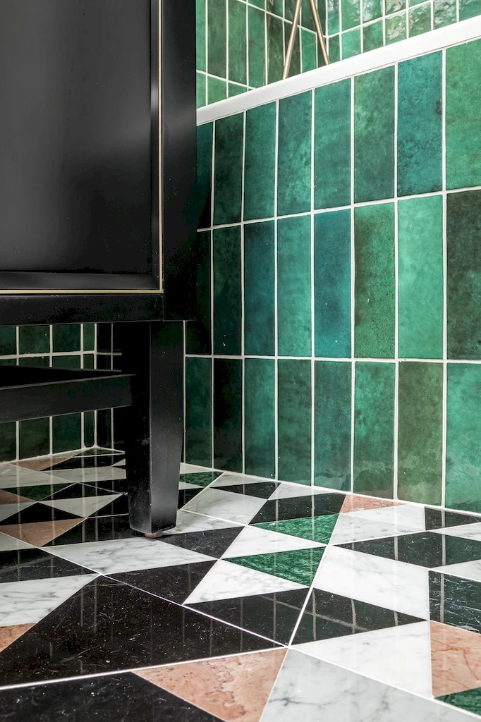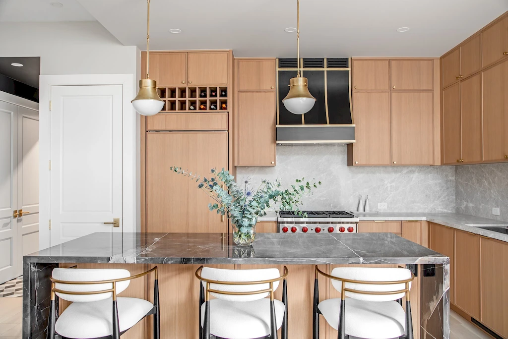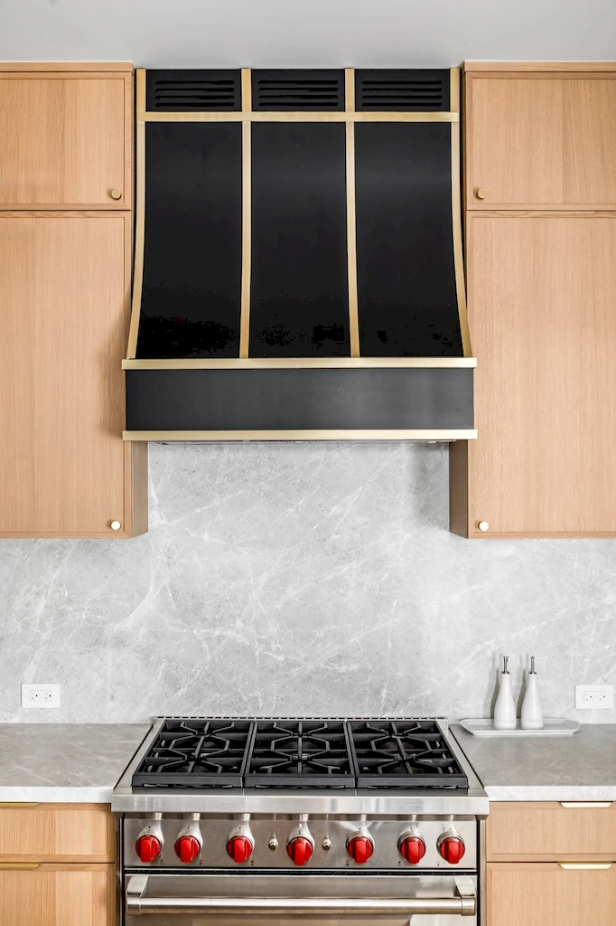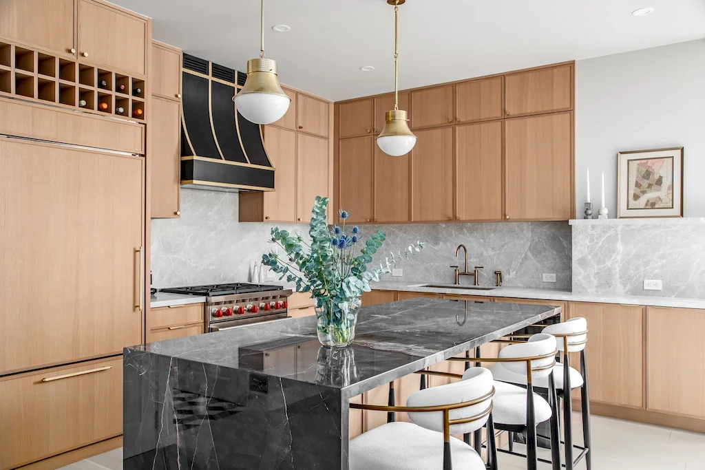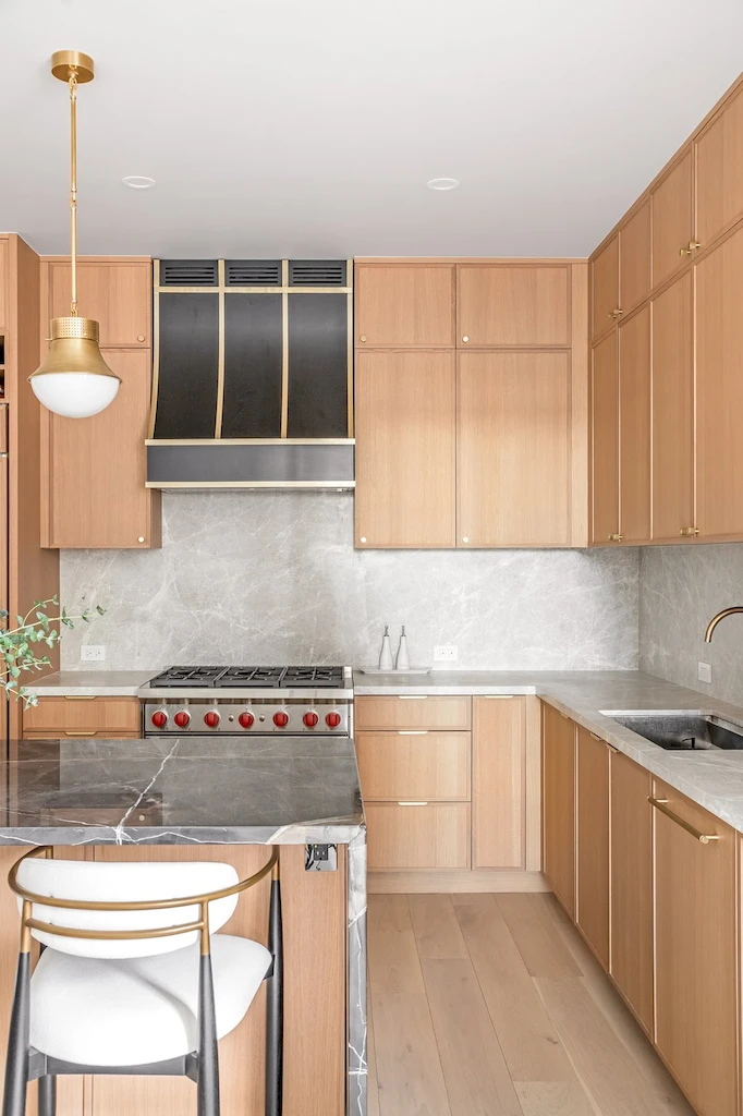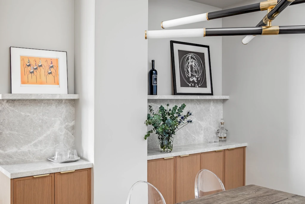 With soaring ceilings and an expansive Calacatta Black Marble Polished waterfall island, the kitchen was designed as the home’s centerpiece for both form and function. Installing the full stone island was no easy feat, requiring precise planning and a labor-intensive lift through the building’s elevator. The island is complemented by Amazing Silver marble on the kitchen countertops and backsplash, along with accent walls and shelving in the adjoining dining room. A black and brass sloped hood ties together the space’s sophistication, while the open layout welcomes guests and makes hosting easy—one of the couple’s top priorities in their renovation. Appliances include a Wolf GR366 range, a Wolf E Series speed oven, and a Sub-Zero refrigerator and wine fridge.