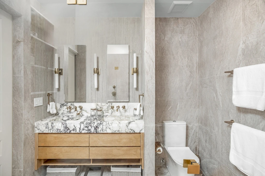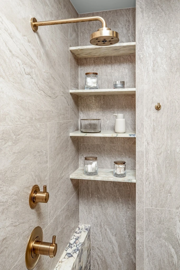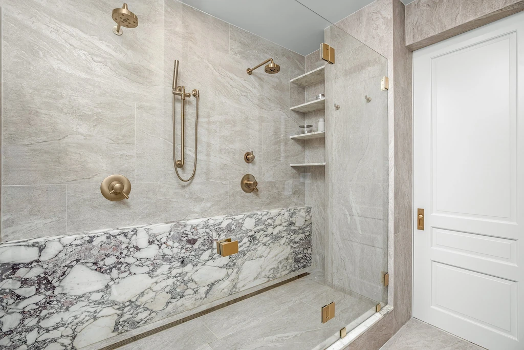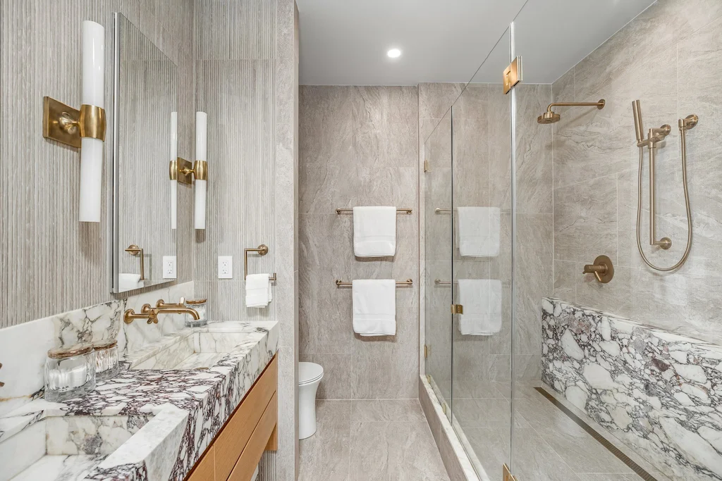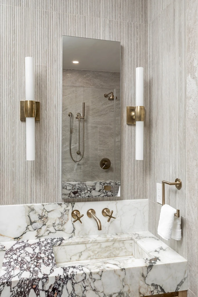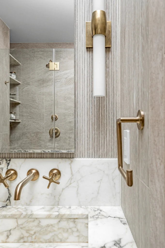 The primary bath was designed as a serene retreat, which can be needed amidst the hustle and bustle of Manhattan. To accomplish the grounded look and feel, our design leaned into natural stone and Earth tones. The approach is anchored with a custom-crafted Calacatta Viola marble vanity, which we also repurposed to create a striking feature wall in the shower, positioned slightly forward to highlight the bold design. In another example of leveraging all materials at hand, we repurposed stone from the backsplash in the kitchen and dining room for built-in shower shelving within the architectural nooks. To add texture and contrast, we paired the richly veined marble with Porcelanosa Ice Minnesota tile for the walls and Austin Natural tile for the floor. Finally, the spacious shower offers dual Brizo Odin Thermostatic brass showerheads to enhance the spa-like experience.