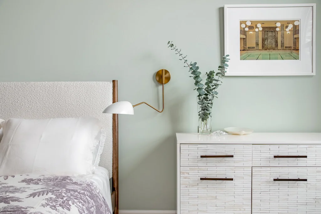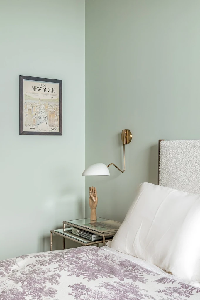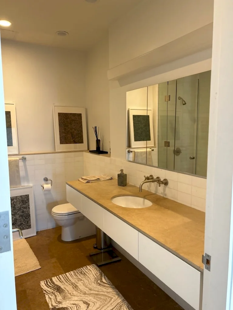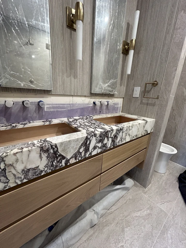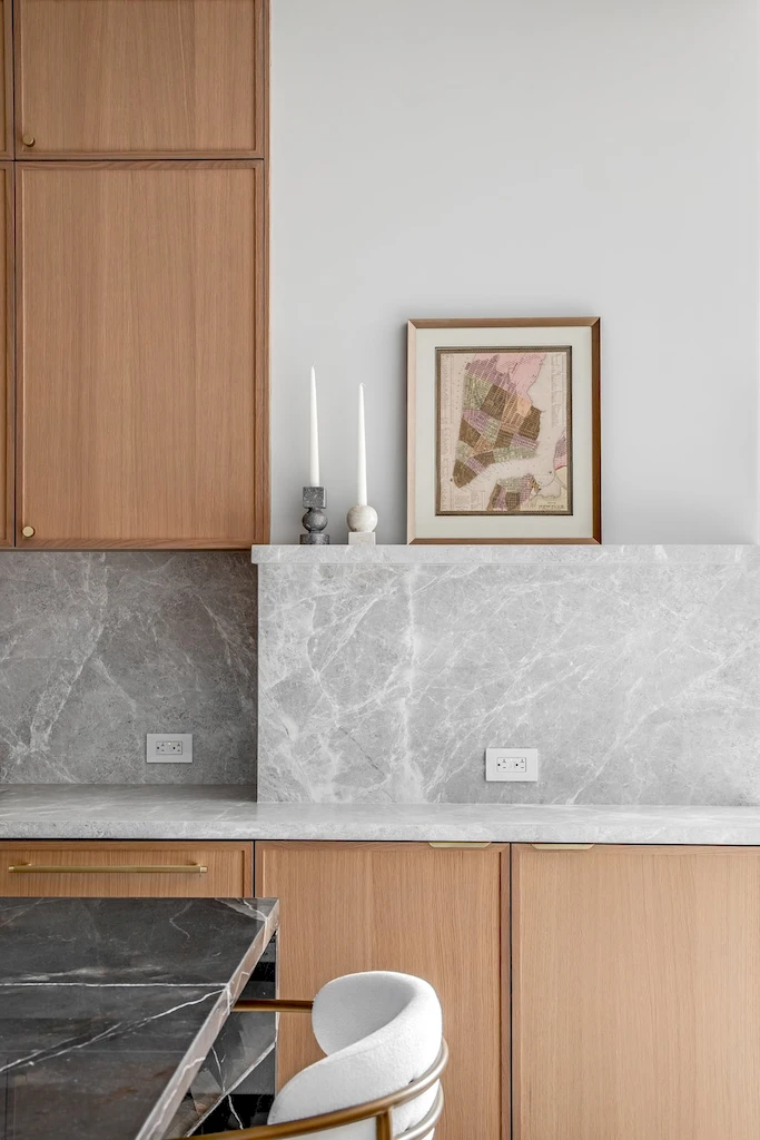 The primary bath was designed as a serene retreat, which can be needed amidst the hustle and bustle of Manhattan. To accomplish the grounded look and feel, our design leaned into natural stone and Earth tones. The approach is anchored with a custom-crafted Calacatta Viola marble vanity, which we also repurposed to create a striking feature wall in the shower, positioned slightly forward to highlight the bold design. In another example of leveraging all materials at hand, we repurposed stone from the backsplash in the kitchen and dining room for built-in shower shelving within the architectural nooks. To add texture and contrast, we paired the richly veined marble with Porcelanosa Ice Minnesota tile for the walls and Austin Natural tile for the floor. Finally, the spacious shower offers dual Brizo Odin Thermostatic brass showerheads to enhance the spa-like experience.