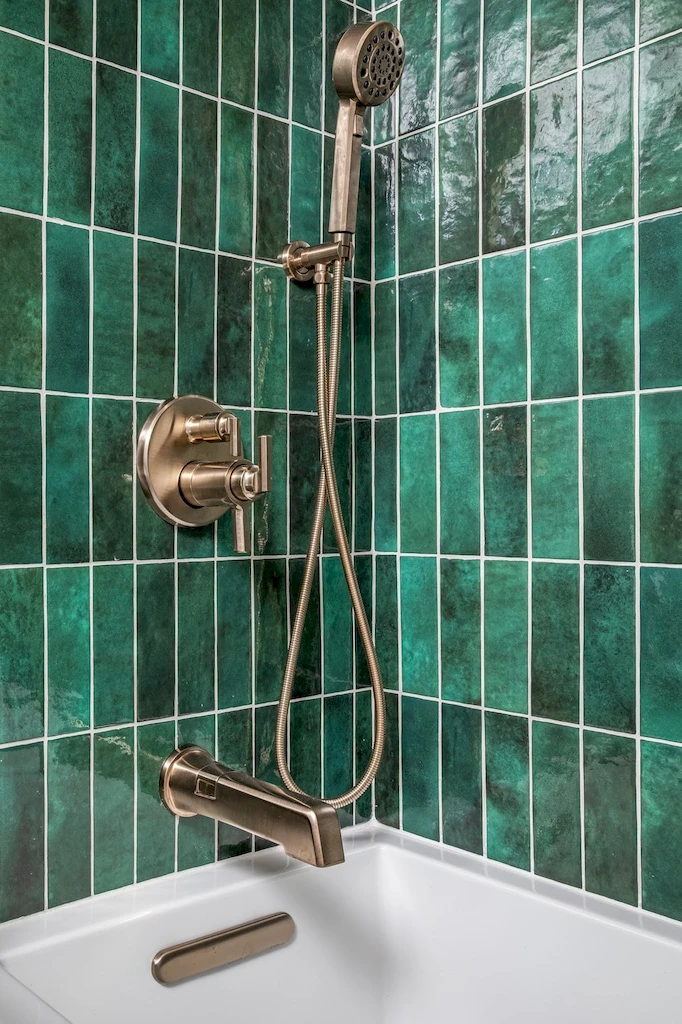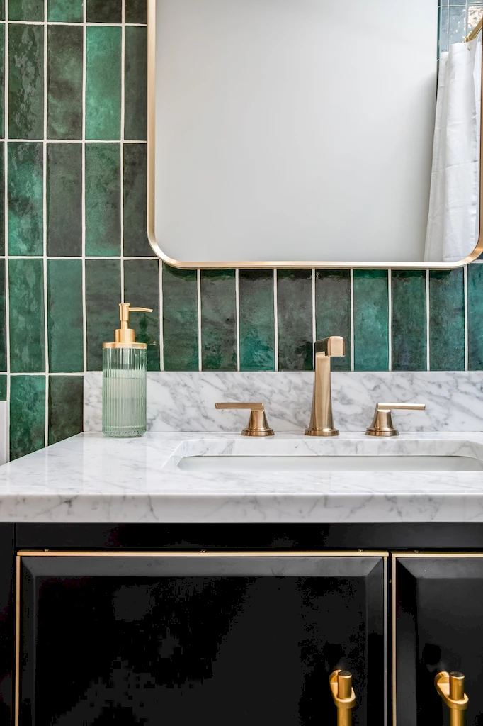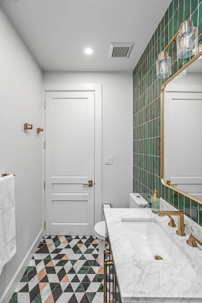 The secondary bathroom delivers a more bold design, providing high-end comfort and elegance at a glance. The countertop stone is a light MSI Statuary Classique quartz, complimented starkly with Bedrosian Cloe Green ceramic wall tiles and extremely choice Prism Rosa Pink Polished Marble Mosaic flooring from Tilebar. The design is accentuated with a matching luxe gold faucet and shower system from Brizo’s Levoir collection.