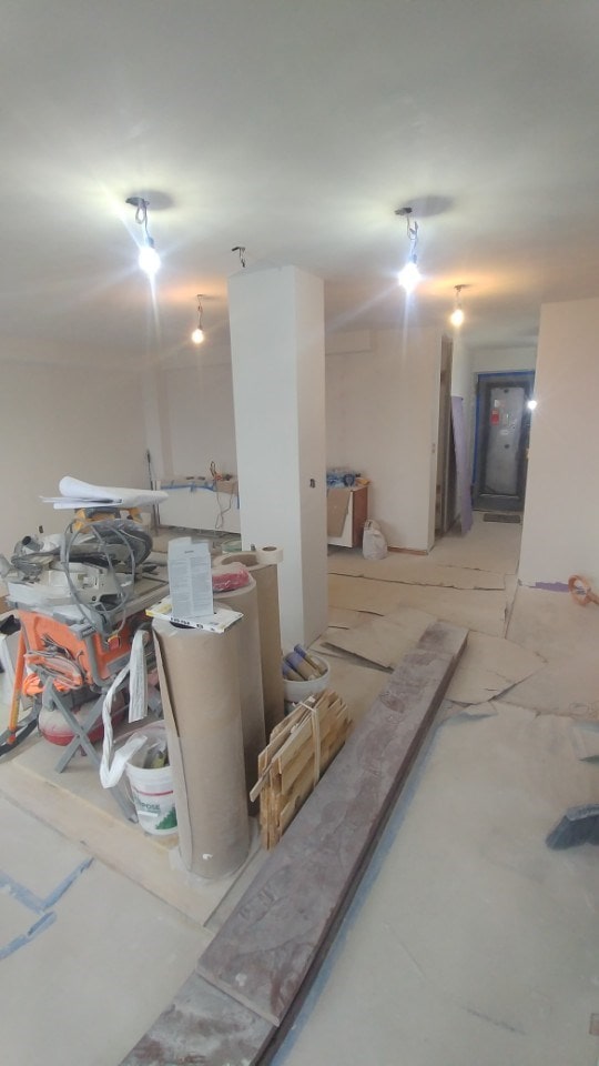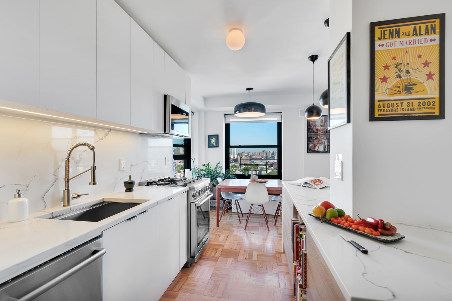 The owners of this Fort Greene apartment hired us for a full home overhaul, requiring a kitchen renovation, two bathroom renovations, two bedroom renovations, plus flooring installation throughout the apartment. For the kitchen remodel, we completely reconfigured the space, reframing walls to accommodate a new island, built-in breakfast nook and an overall more functional flow. Each set of bed and bathrooms were completely redefined as well, as we reconfigured the walls to make each space bigger and more accommodable to the needs of our client's growing family. Finally, we installed five finger mosaic parquet wood floors throughout the main living space to provide a timeless foundational touch.