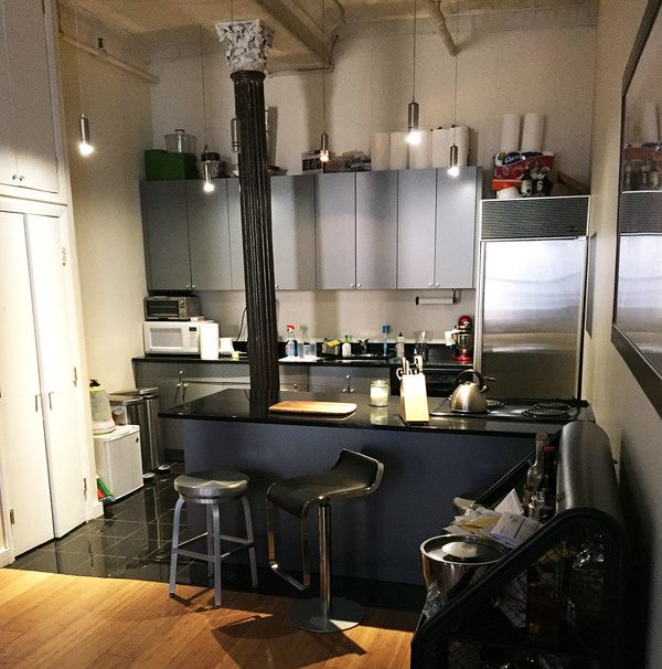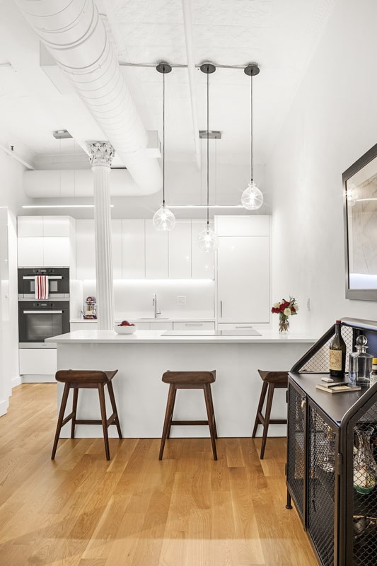 This SoHo loft renovation is located in the cast iron historic district. The owners of this loft apartment hired Gallery Kitchen and Bath to renovate their kitchen and bathroom while also replacing their hardwood flooring, adding an HVAC system and custom built-ins in the living room. As is the case with many loft renovations throughout Manhattan, there are certain design challenges that exist due to present columns and ceiling heights. Adding an HVAC system into a loft also presents an additional challenge both from an aesthetic and building board compliance standpoint. For example, working with the existing columns in the loft without having them obstruct the swings of the kitchen cabinets or the overall layout of the kitchen. Another challenge in this NYC apartment renovation was adding an HVAC system while finding a place to hide the air handler in an open space without taking away from the ceiling height – all while complying with the buildings board alteration requirements.