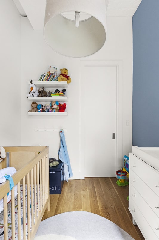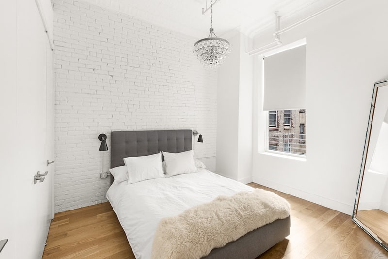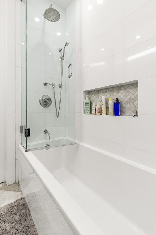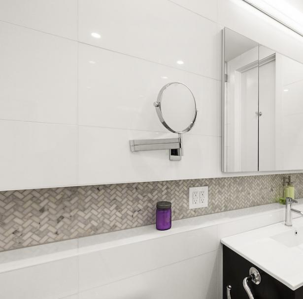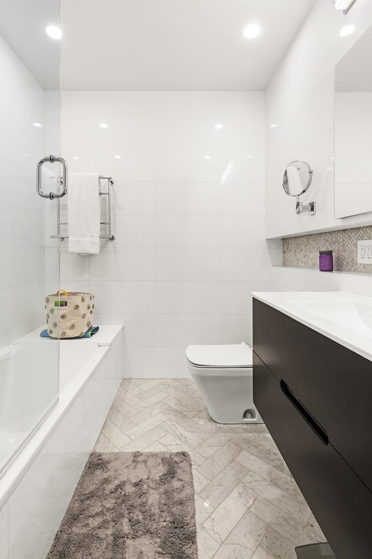 Rounding out the completion of this soho loft renovation was the bathroom. Incorporating a white modern bathroom with a touch of accent wall tiles in a herringbone pattern brought texture to the space. Our design team also incorporated a custom niche to further create texture in the mostly white modern bathroom, all while solving for storage.