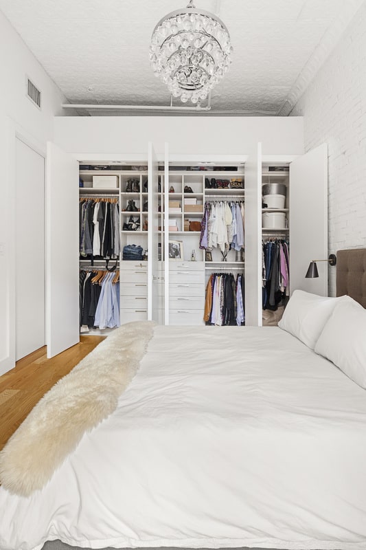 With the kitchen being complete, what about the outstanding issue of where to place the air handler? Staying true to the ceiling height of the loft, it did not make any sense to bring the ceiling height down in the kitchen or living room to accommodate the air handler. Since we were also renovating the bathroom, our design and build team lowered the ceiling height in the bathroom to 9.5 feet. This was done to allow room for the air handler to be installed while simultaneously hiding the access panel in the adjacent closet, completely absent from any view.