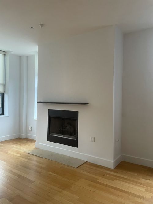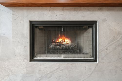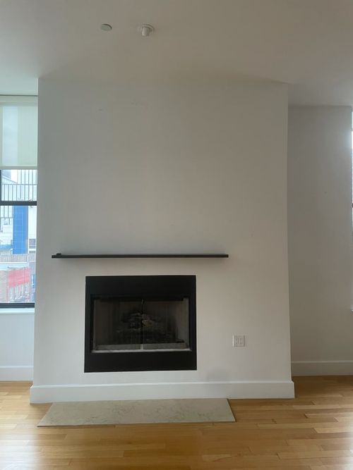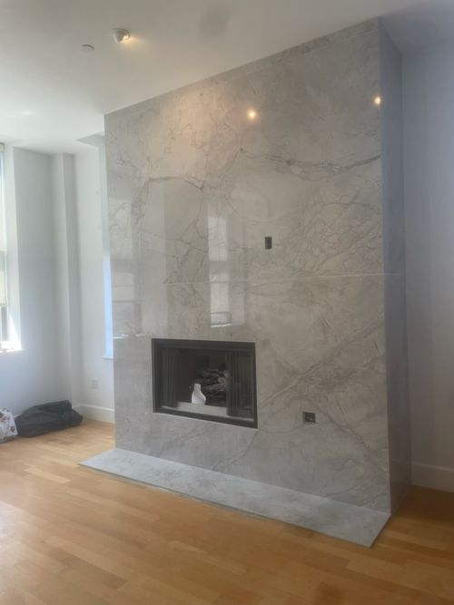 Although the fireplace naturally stood out, our clients’ goal was to make it the condo's proper focal point. To accomplish this, we brought in large porcelain platform tiles, delivering a textured metallic style that’s both modern and accessible. However, the eye-catching look didn’t come easily, as the complexity of the fine material required us to cut all pieces perfectly to size off-site, then bring them in via elevator - which wasn’t always reliable. The result is a stunning centerpiece that fortified their contemporary design goal.