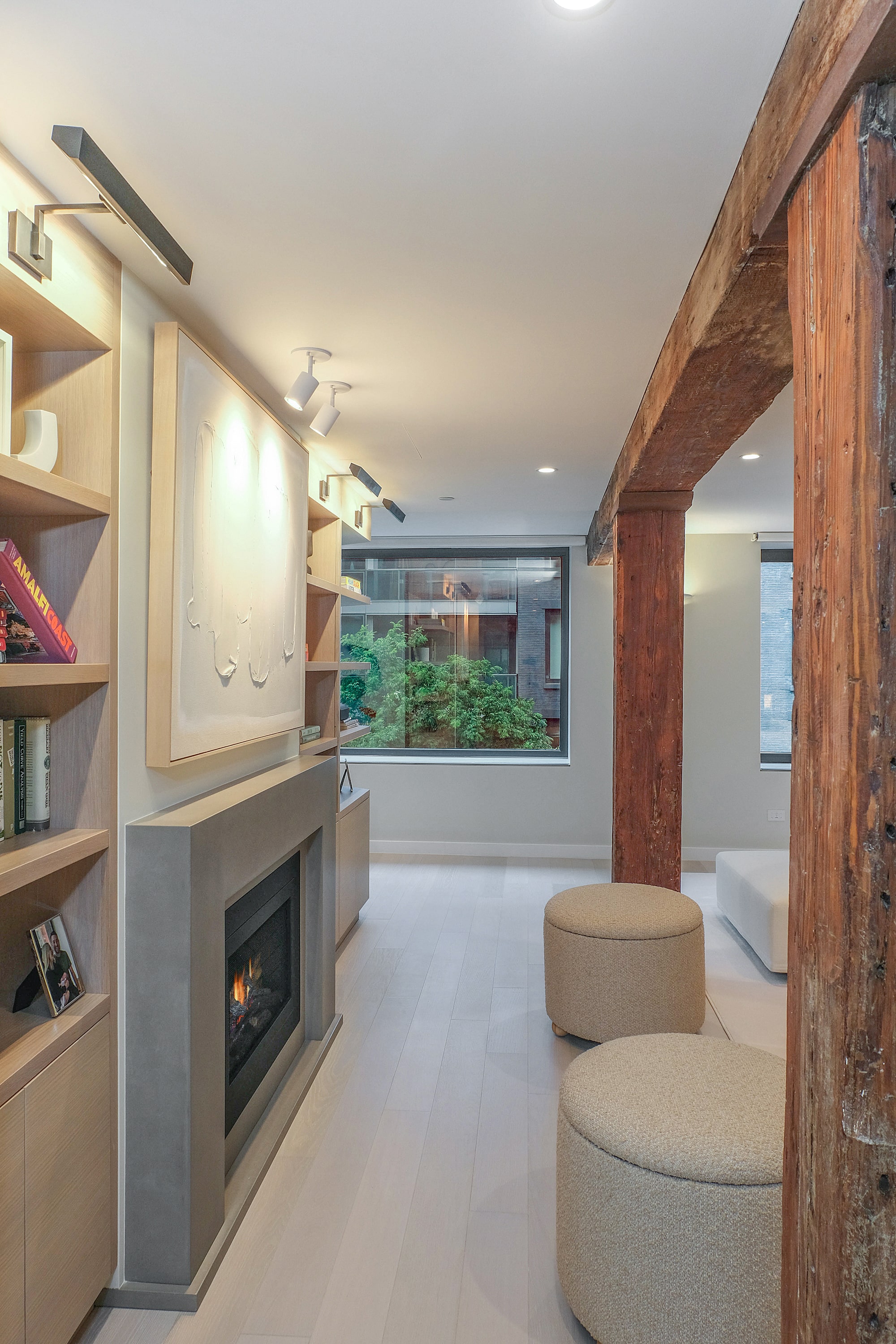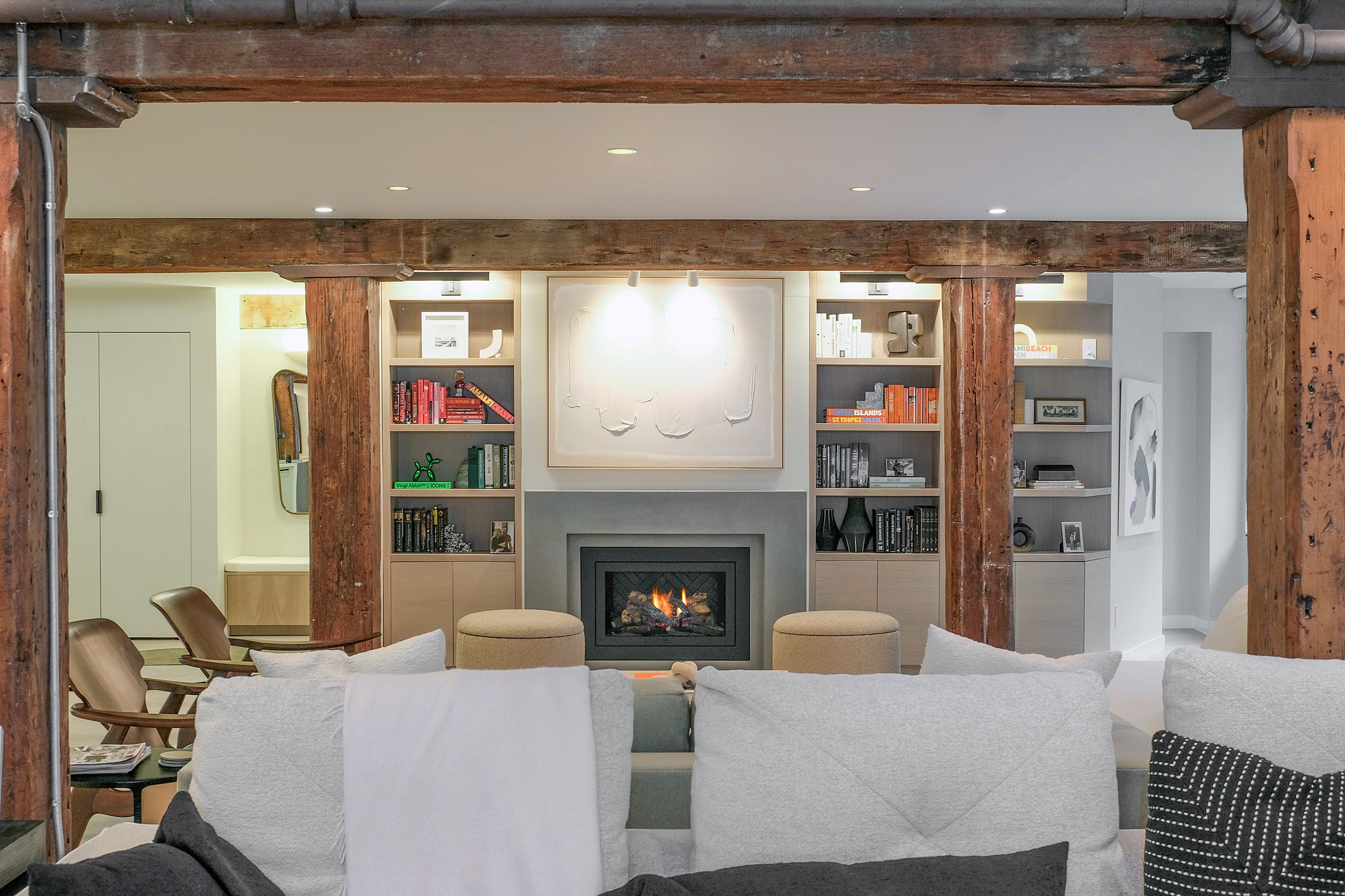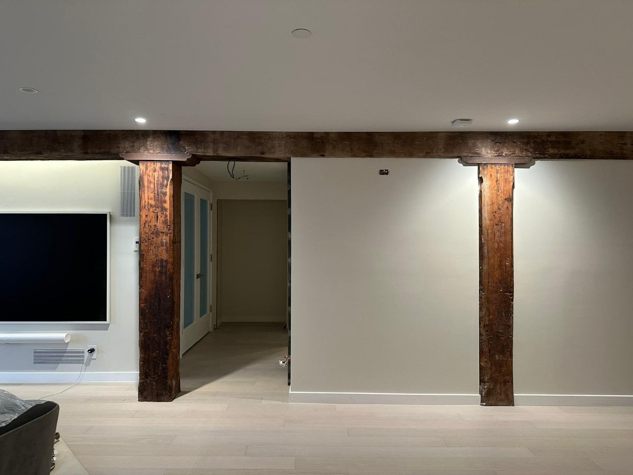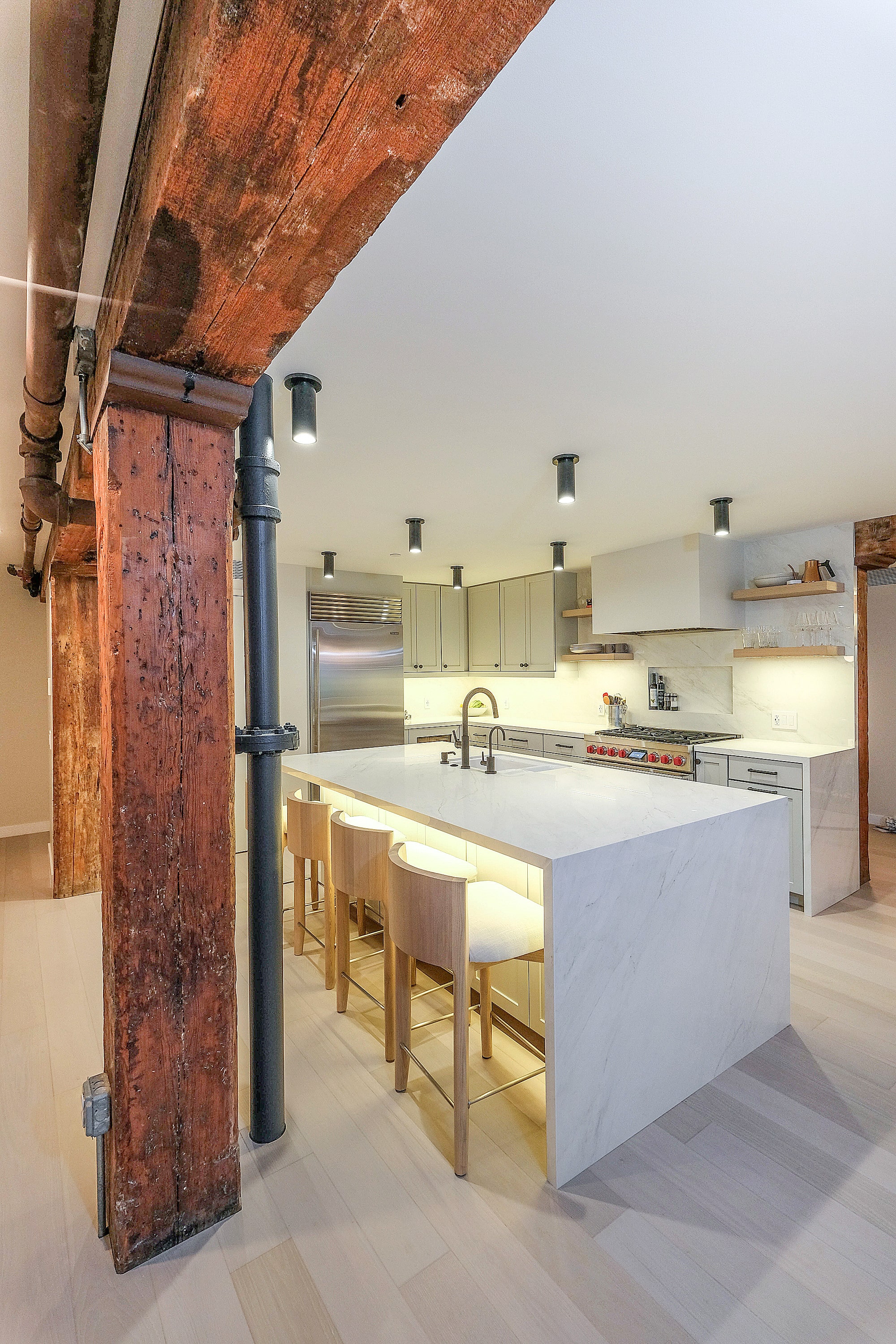Although the space required plenty of love to meet the client’s desired look, we ultimately had to find a design balance that didn’t deviate too far from the traditional loft look that makes the space unique and still felt modern in practice. To accommodate, we restored the large wooden beams throughout the space, cleaning and varnishing them to provide an added pop when contrasted against the lighter tones from the Leonia white oak floors and repainted taupe-colored walls. The result is a balance that feels both comfortable and contemporary.