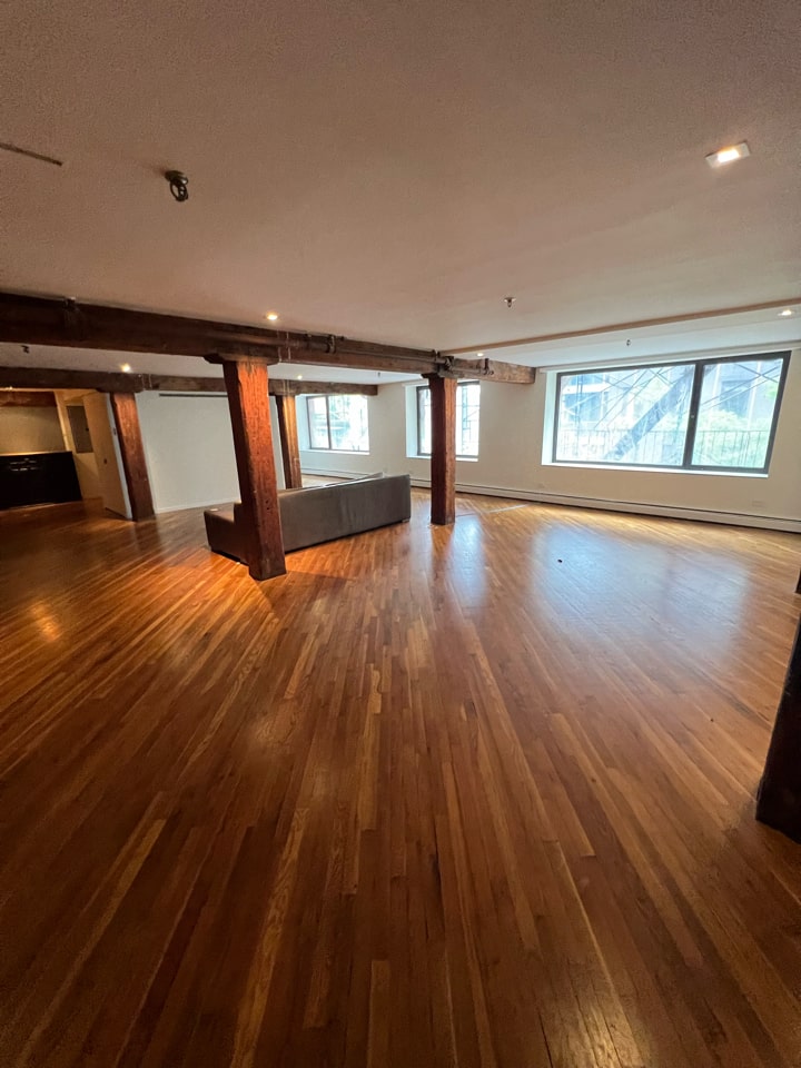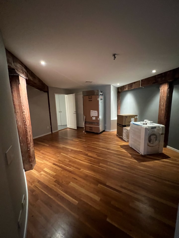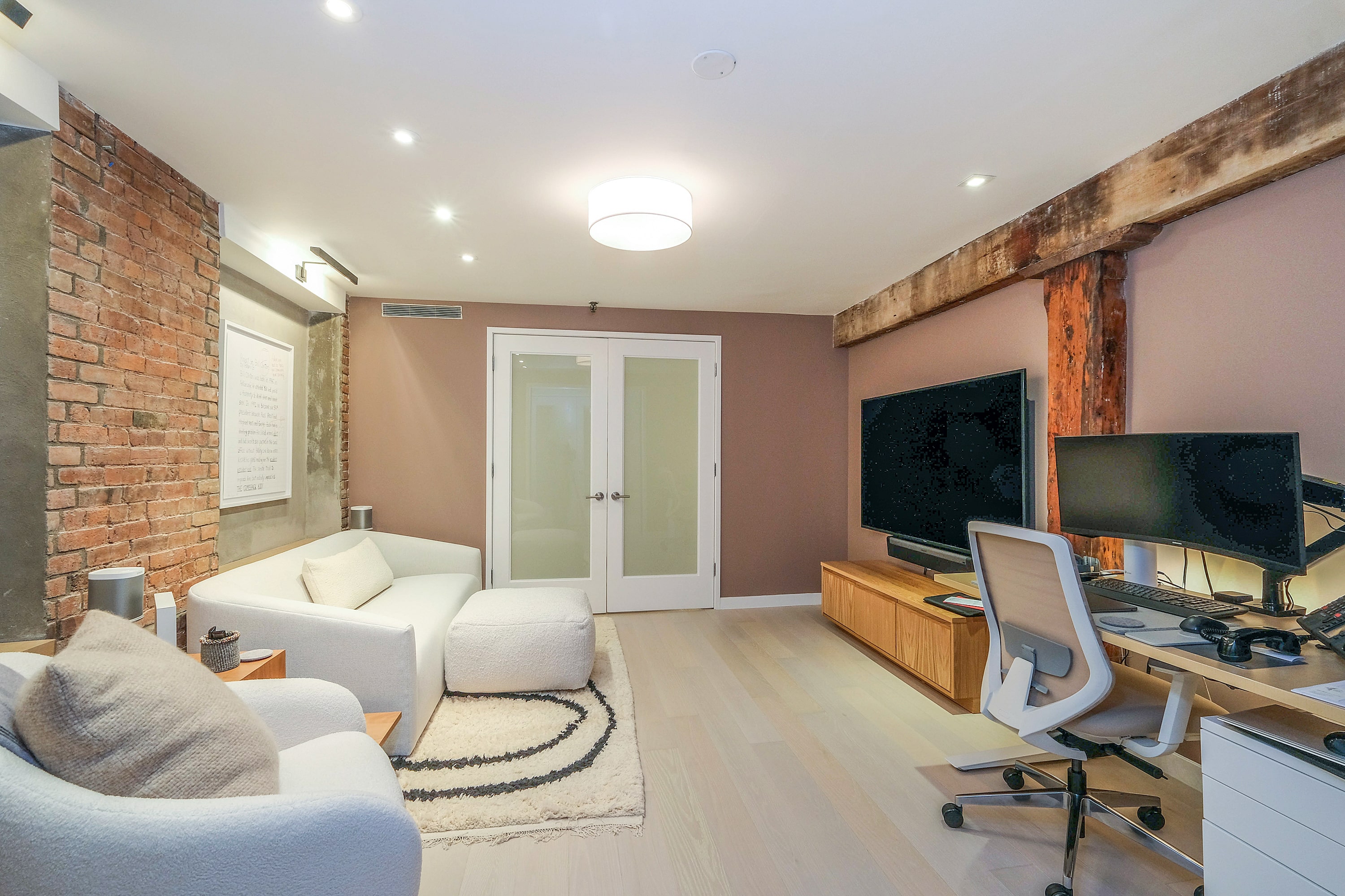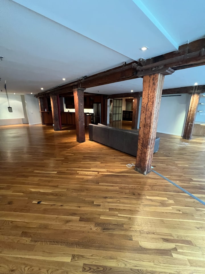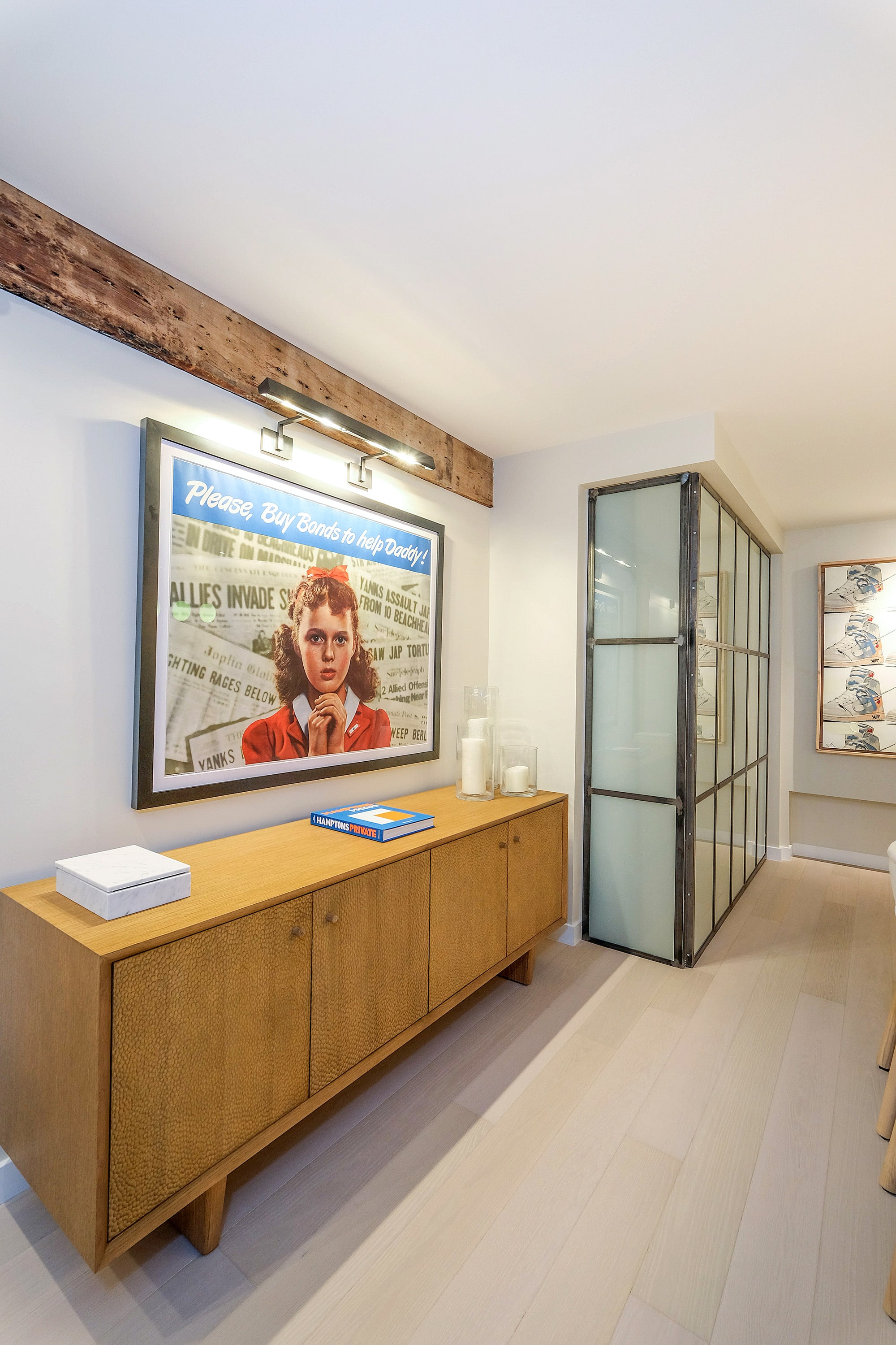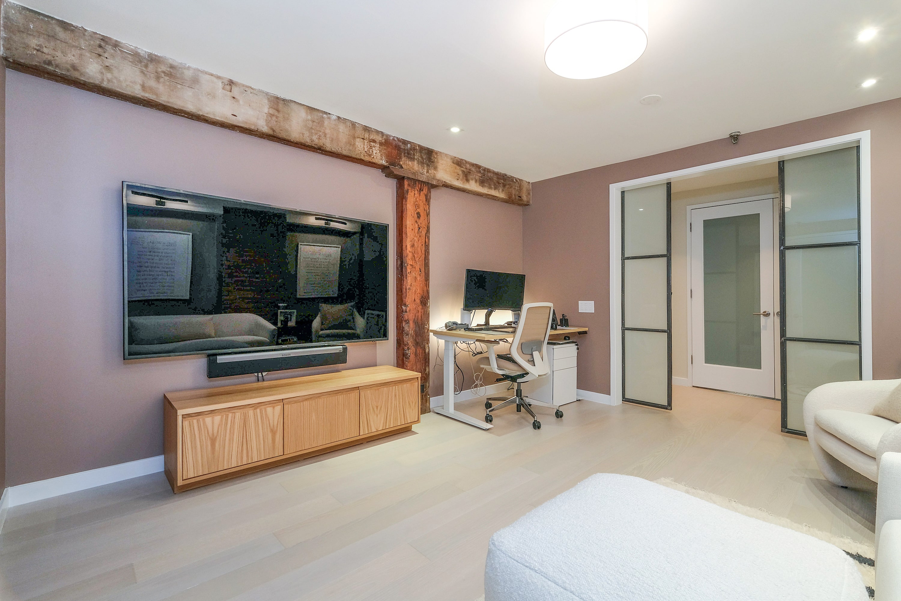 Although the space required plenty of love to meet the client’s desired look, we ultimately had to find a design balance that didn’t deviate too far from the traditional loft look that makes the space unique and still felt modern in practice. To accommodate, we restored the large wooden beams throughout the space, cleaning and varnishing them to provide an added pop when contrasted against the lighter tones from the Leonia white oak floors and repainted taupe-colored walls. The result is a balance that feels both comfortable and contemporary.
