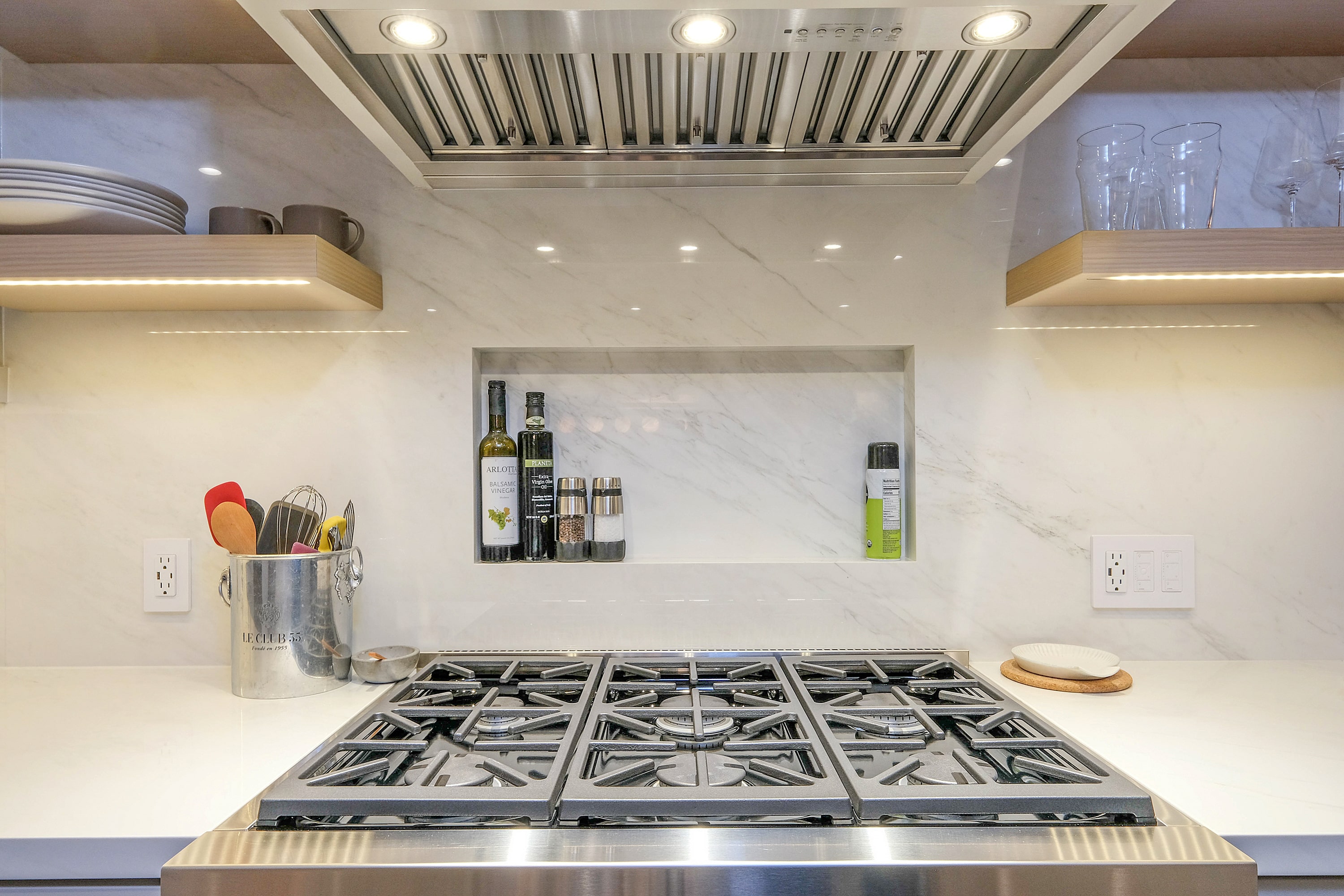 Since the original, 80s-inspired kitchen didn’t exactly meet design goals, we reconfigured the floorplan to open up the cooking area and create a more functional layout. By moving the refrigerator and adding an island with inset-seating, we were able to expand the footprint and provide our clients with a more modern, statement kitchen. Both the island countertop and kitchen backsplash are made from matching Glem White marble for added allure.