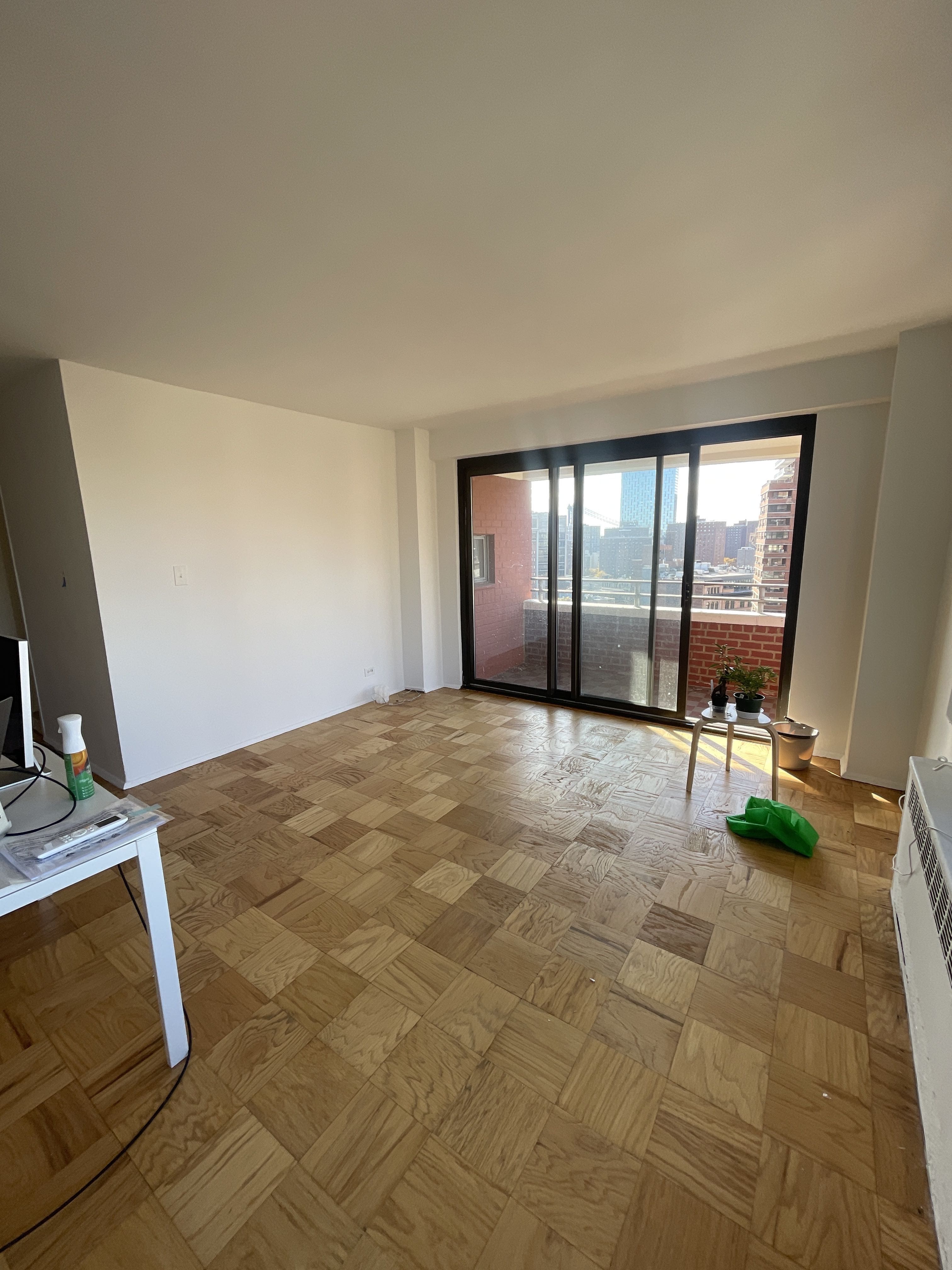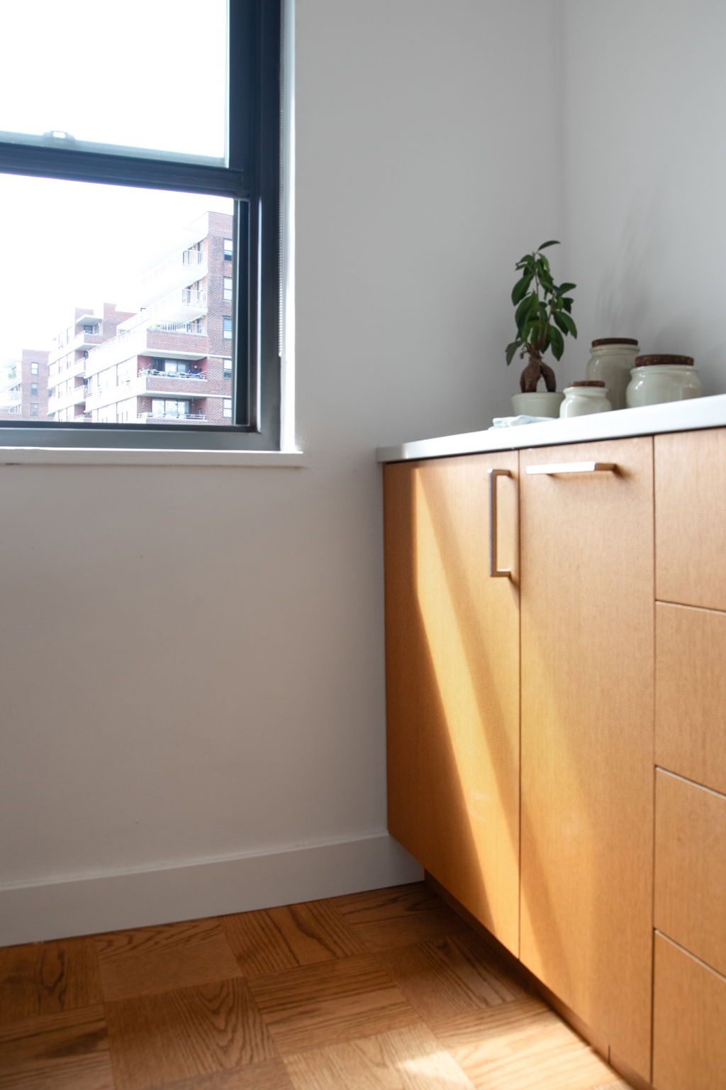 Inspired by resort‑meets‑mid‑century Mexico, we reimagined the kitchen to be more warm and inviting, serving as a focal point for delicious eats and open arm entertainment. We enlarged the room to flood the space with natural light and expanded the Caesarstone Cloudburst concrete island into a true centerpiece. Eco‑conscious Fisher & Paykel appliances blend performance with sustainability (a specific request from the client), while floating shelves, a custom microwave cubby, and a slim shelf above the balcony window keep essentials close without cluttering the space. Finally, we restored the 1950s parquet floors, tying the redesign back to the building’s history, creating a kitchen that feels both fresh and timeless.