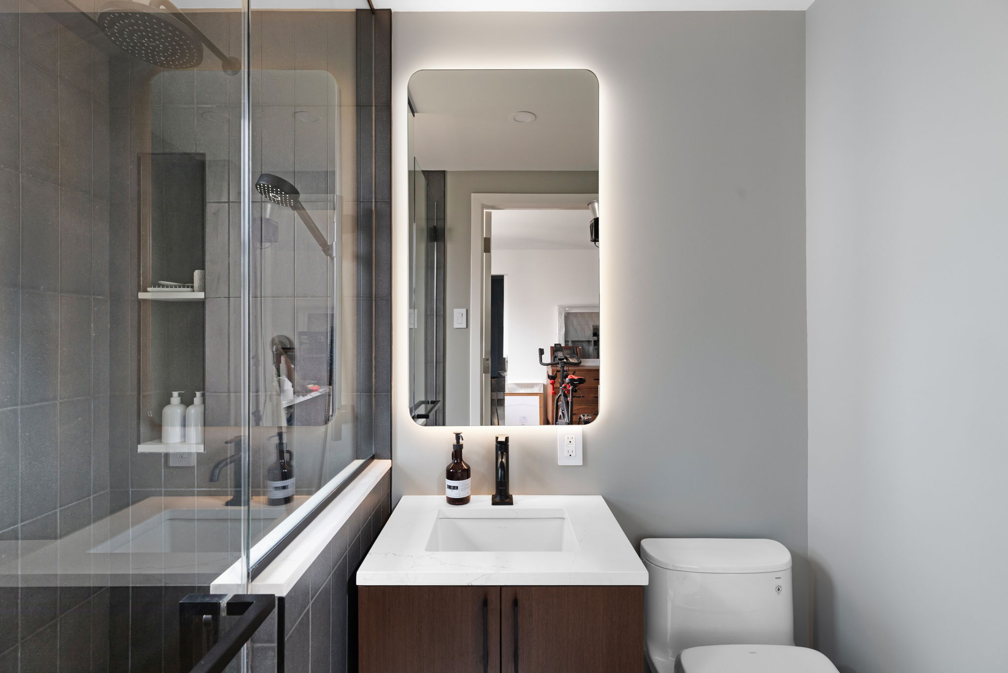 The primary bathroom proves a small footprint can still feel upscale. The compact space features modern Kohler fixtures, a surface‑mount Robern Presence medicine cabinet, and carefully crafted details like a custom glass shower enclosure and floating walnut vanity. Together, these choice elements elevate the room’s elegance, while reiterating the home’s modern design. Meanwhile, the powder room embraces personality with bold Schumacher Indigo Garden wallpaper, a wall‑to‑wall tinted mirror, oval coupe wall sconce lighting and a stylish handmade Mini Manhattan concrete sink from Concretti, welcoming guests into the home’s most vibrant, jewel‑box corner.