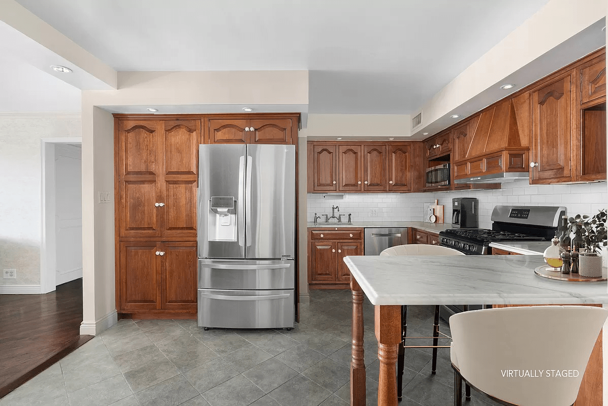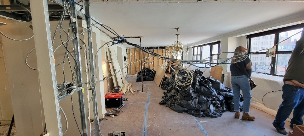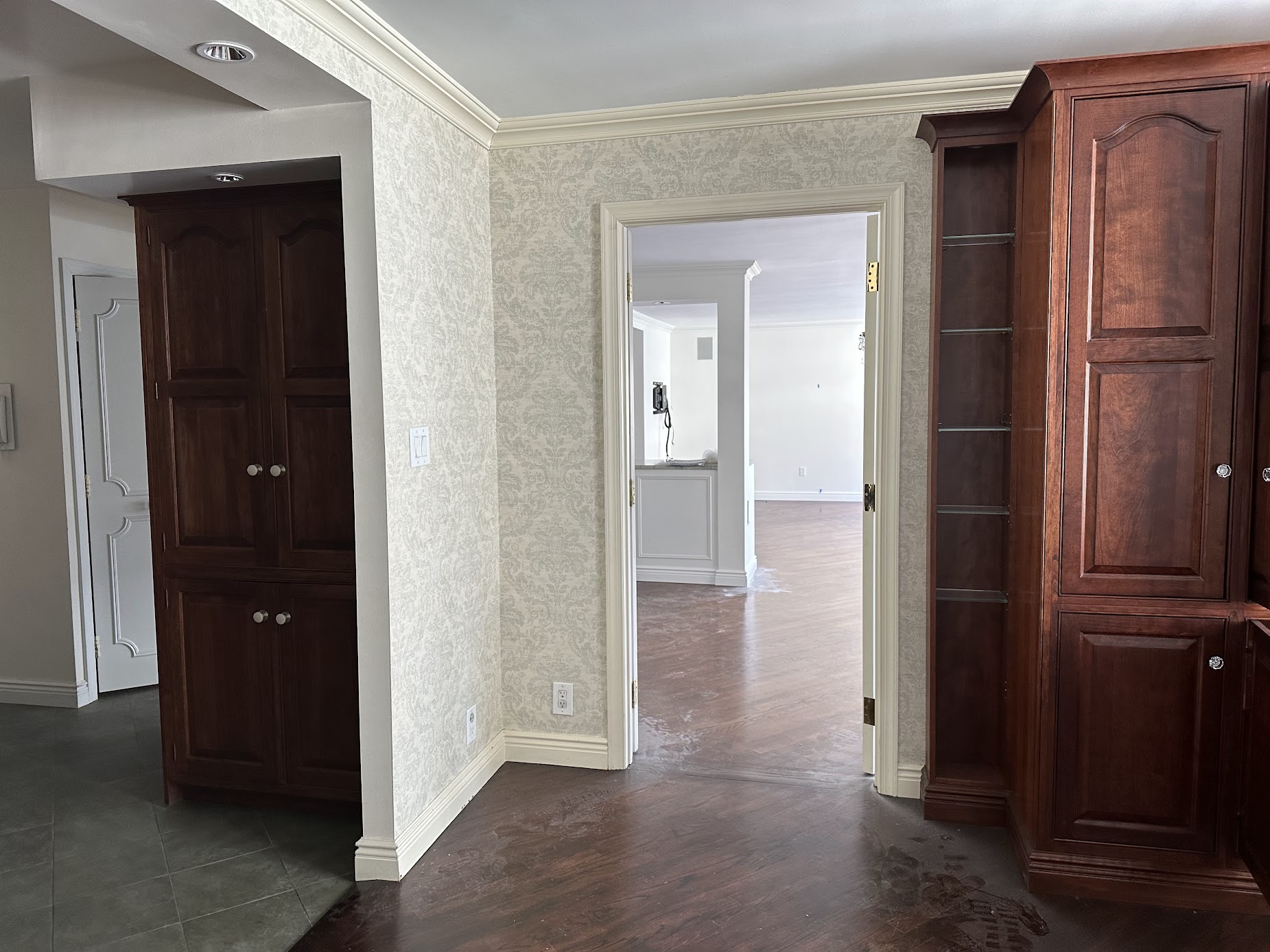 With a massive footprint and strong bones, the clients wanted to open up their layout with a unified kitchen, dining room and living room, then refine the space with a more transitional design. That’s when they partnered with Gallery for a full apartment remodel, welcoming our all-inclusive design-build approach. However, with an awkward floor plan, uneven flooring, dated wallpaper, stale cabinets, and overwhelming old built-ins, our work was cut out for us.