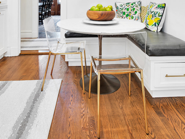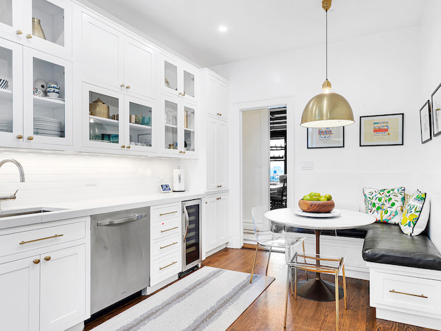 The clients have a big family, so the space needed to be reconfigured to accommodate that, at least in part. Alongside the new floors, in-set cabinetry with glass panels, and classic tile backsplash, we built a dining nook right into the kitchen.
