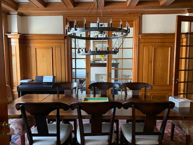 The parents are both busy professionals, so a functional and aesthetically pleasing home office area was key. To that end, we rejuvenated the existing space with fresh wallpaper, refinished woodwork, and built-in bookshelves.