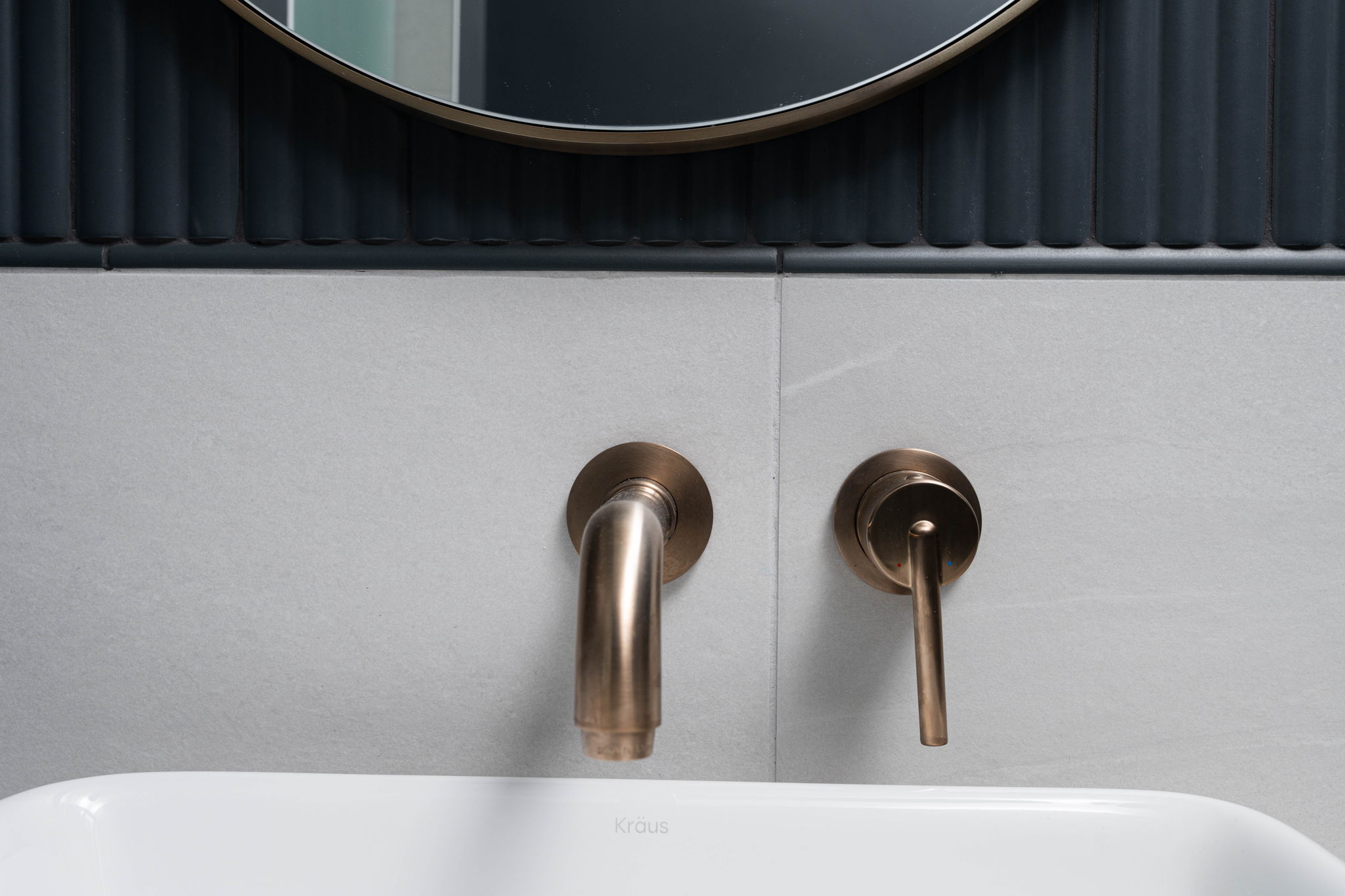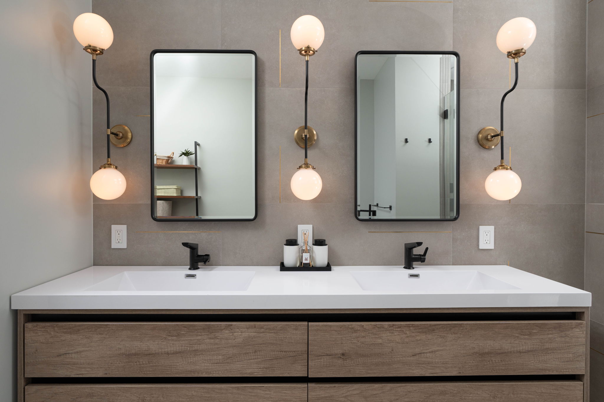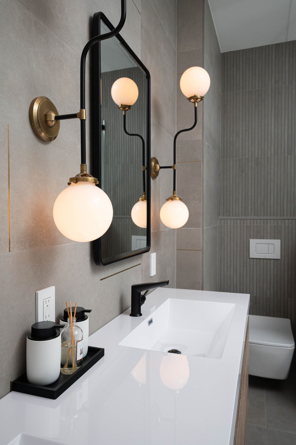 The overall aesthetic aimed for modern minimalism, with a touch of elegance in the powder room, featuring a stunning cascade chandelier and textured tile. The en suite bathroom showcased a blend of two finishes, brass and black, complementing the brass inlay in the tile. Plumbing fixtures embraced an all-black theme, while light fixtures artfully combined black and brass. The clever use of iridescent tiles added a delightful touch to the childrens’ bath, repeating in the shade of wall lights, creating an atmosphere that's both clean and simple yet captivatingly stylish.