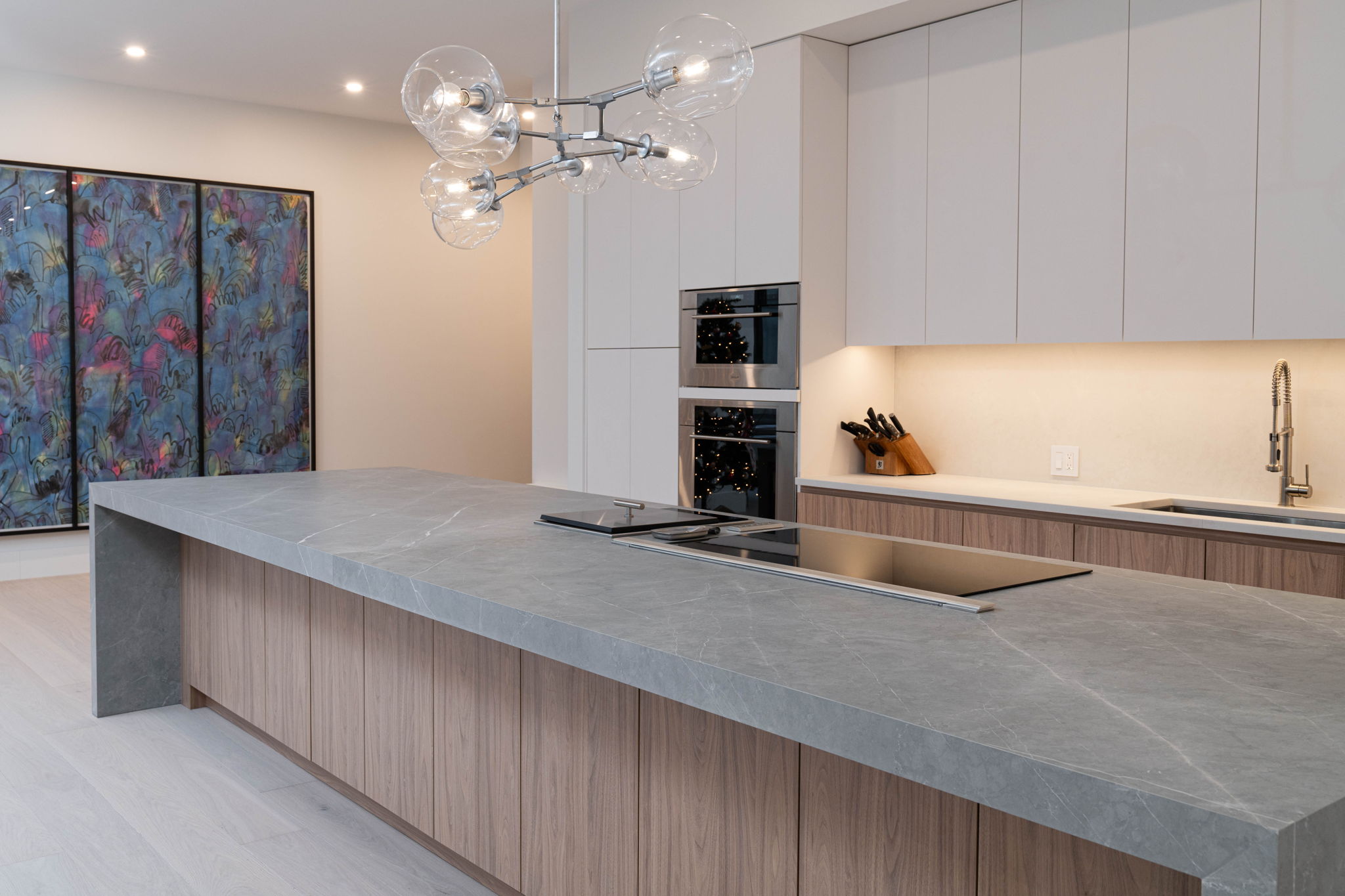 The sleek, uniform kitchen cabinets are built from an innovative interior material called FENIX, which is not painted, fingerprint-resistant and won’t dull over time, offering a sleek yet durable environment that can withstand wear and tear for years to come.