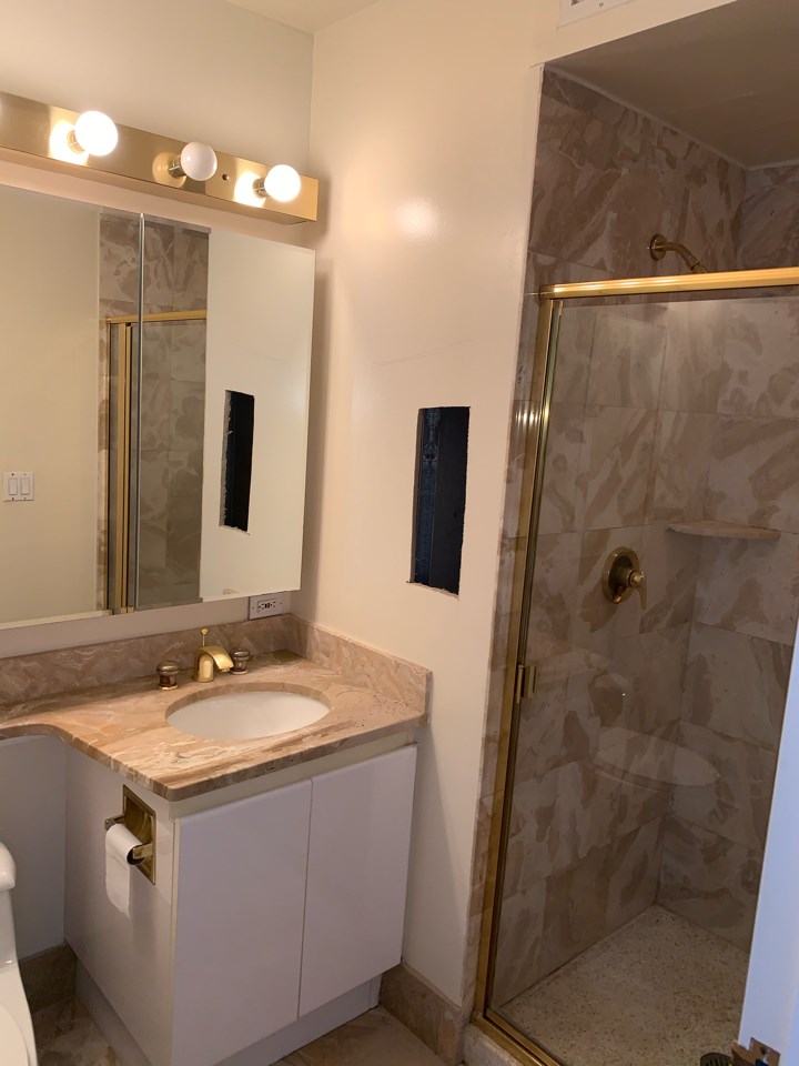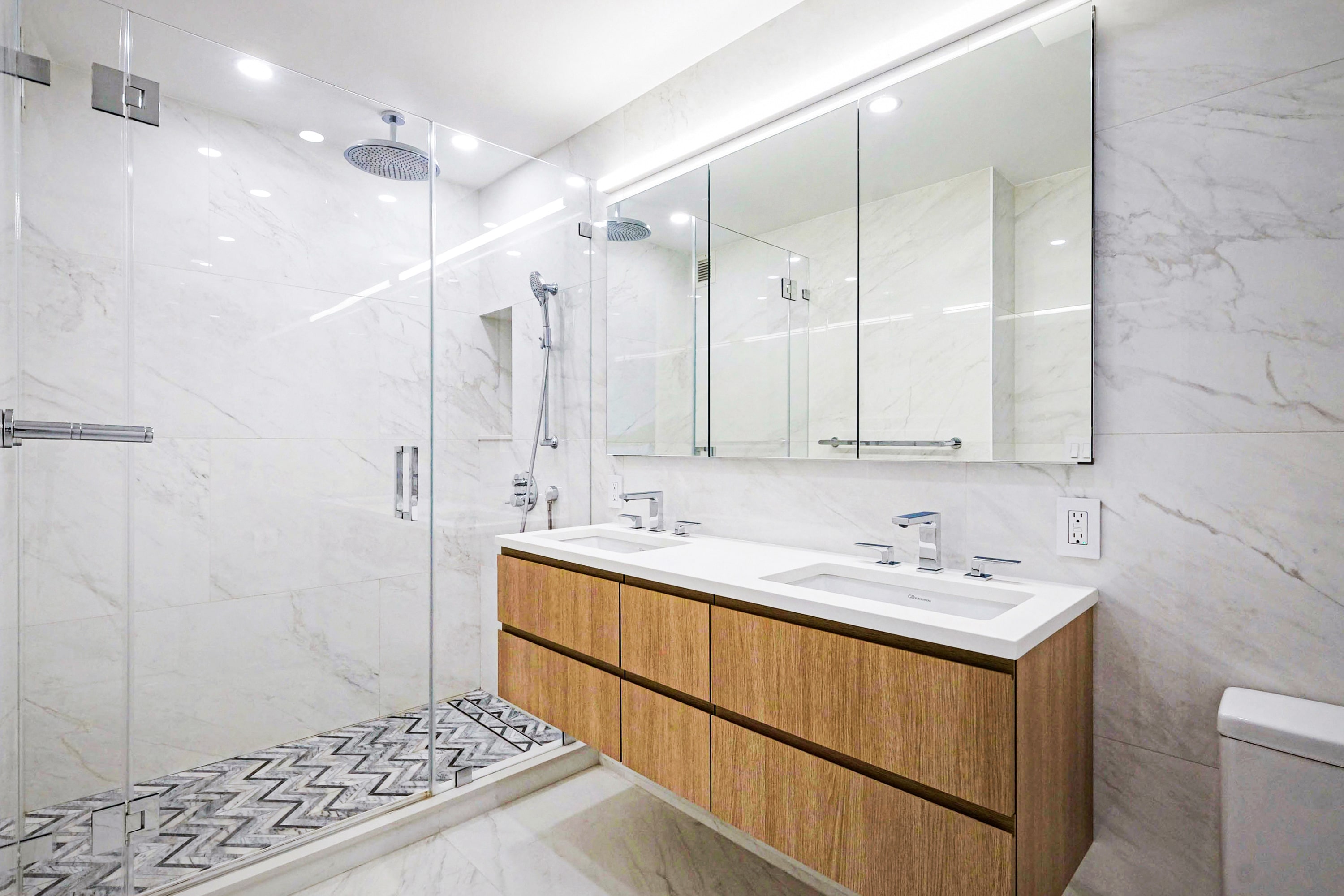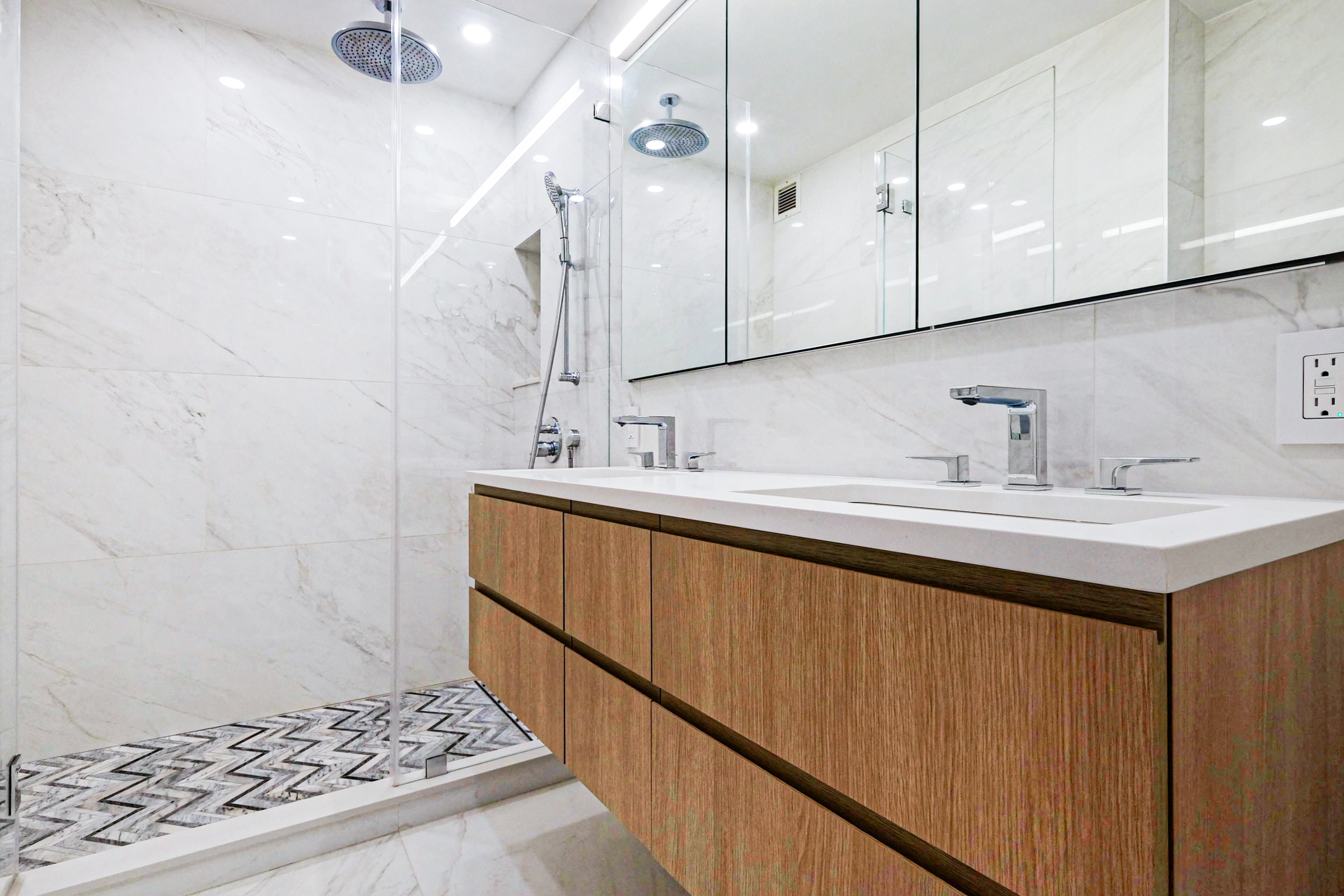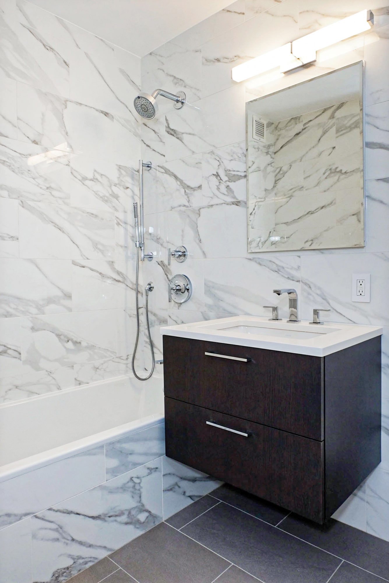 Three bathroom remodels were required in this NYC condo renovation, all of which had their own challenges. One of the en suite bathrooms required us to reconfigure the shower and the toilet for preferred placement and a bigger shower space than the prior stall, and moving the shower created some plumbing issues we had to accommodate.