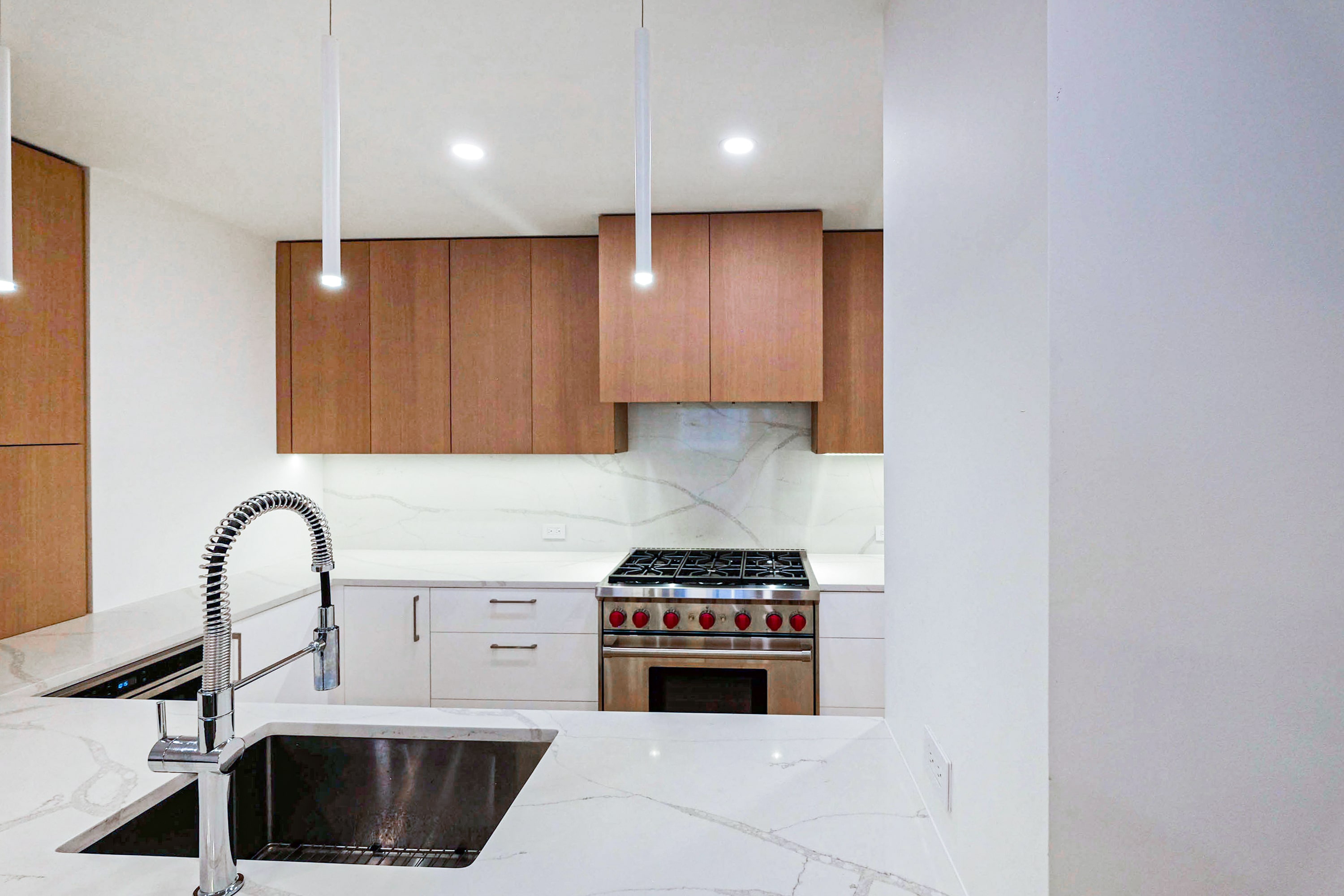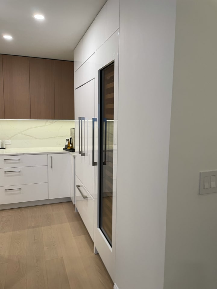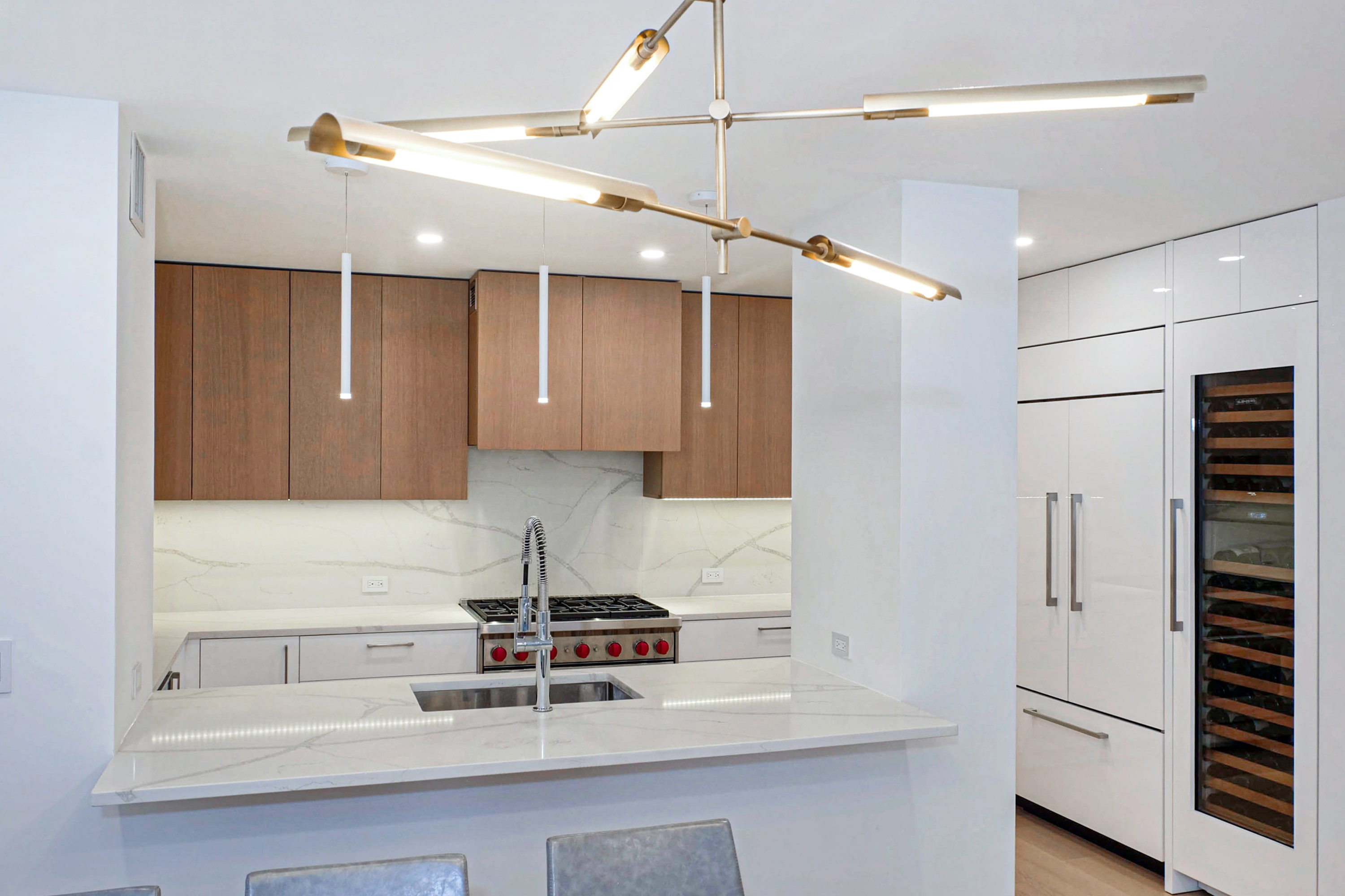 A client priority of this NYC condo renovation was to open up the kitchen, requiring us to create a pass-through, which we accented with hanging modern Eurofase pendant lights. Clearing the space also required us to remove various unwanted curves and angles from the foyer, which we did in great detail. The glossy Calacatta Verona quartz countertops and backsplash are complemented by a combination of Miralis Simply White cabinets on bottom and creamy, frameless oak Macchiato cabinets up top - creating an overall luxe setting that resonates across the whole condo.