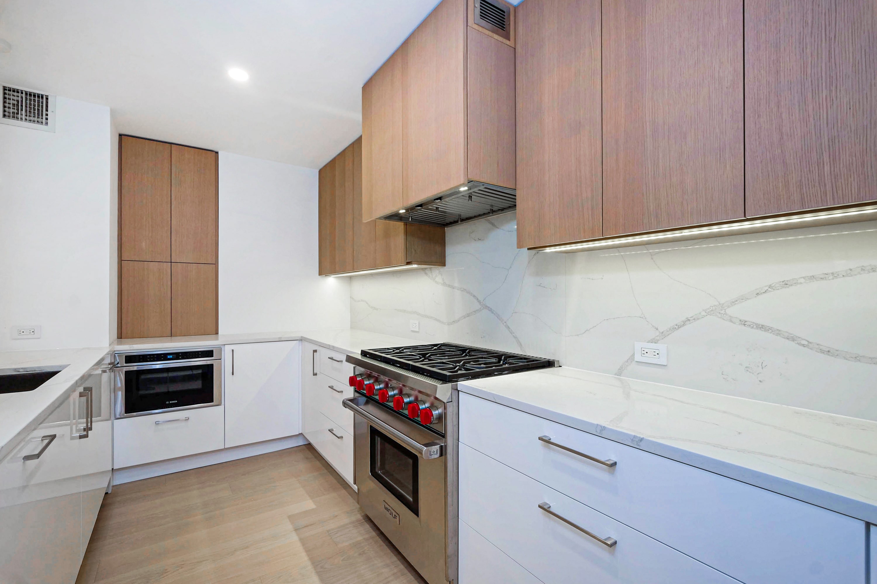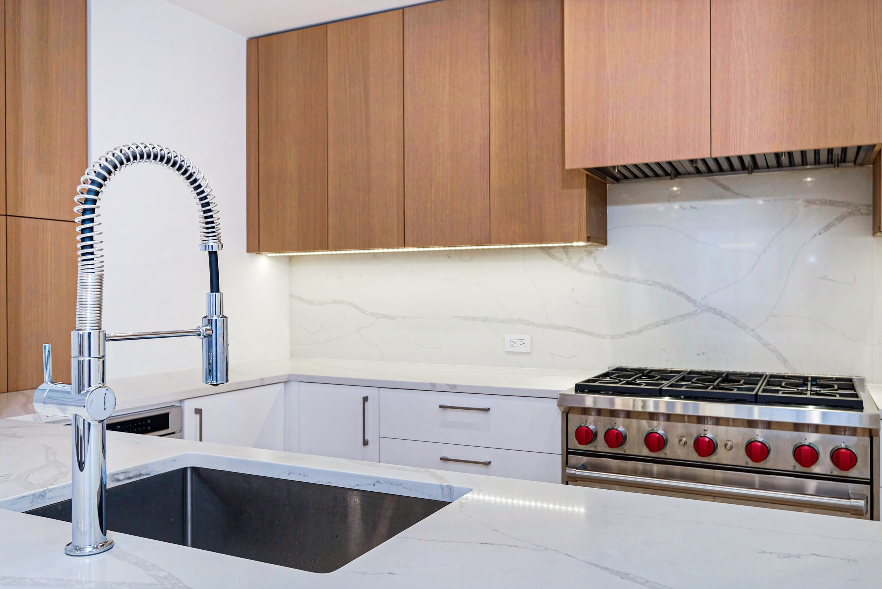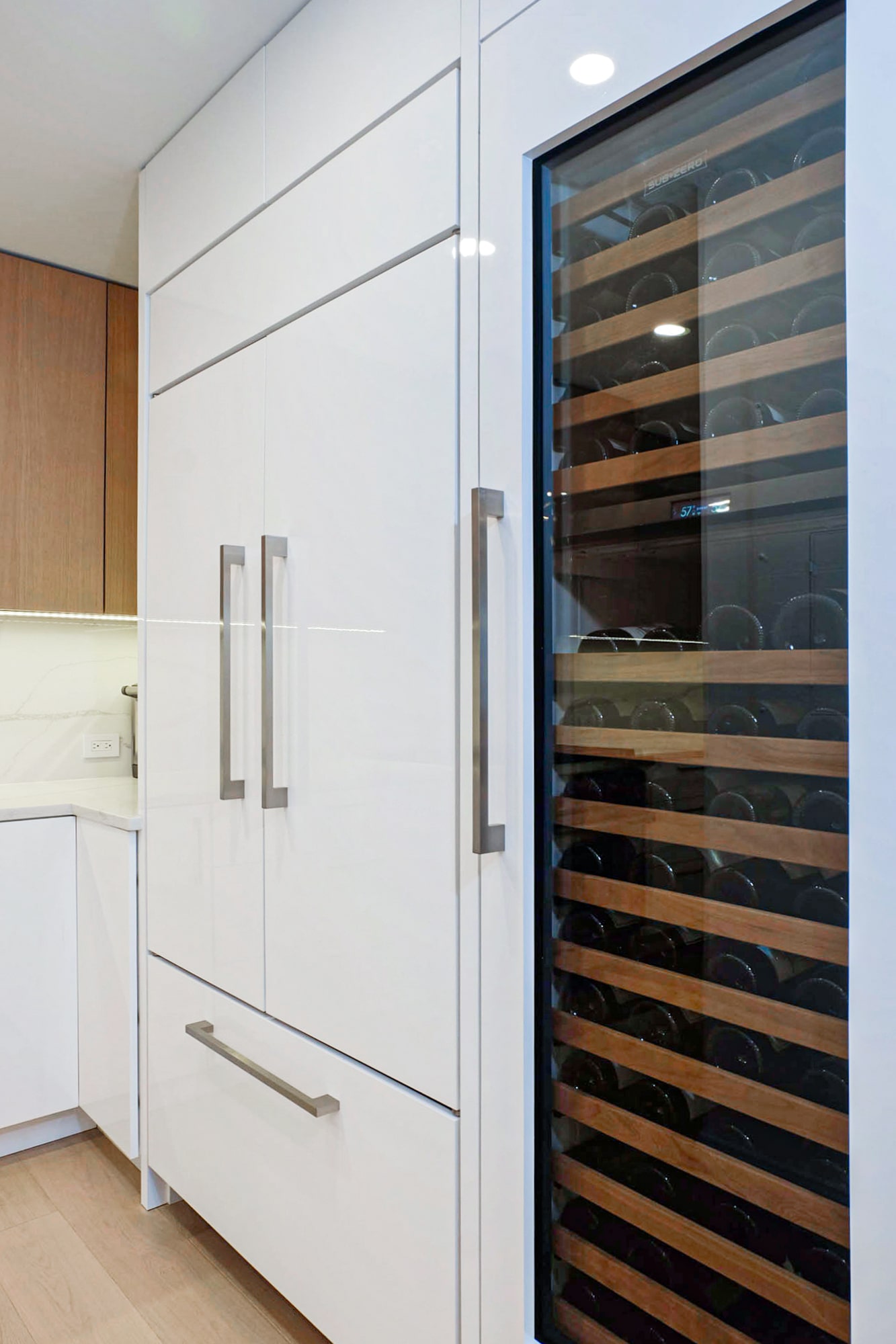 A client priority of this NYC condo renovation was to open up the kitchen, requiring us to create a pass-through, which we accented with hanging modern Eurofase pendant lights. Clearing the space also required us to remove various unwanted curves and angles from the foyer, which we did in great detail. The glossy Calacatta Verona quartz countertops and backsplash are complemented by a combination of Miralis Simply White cabinets on bottom and creamy, frameless oak Macchiato cabinets up top - creating an overall luxe setting that resonates across the whole condo.