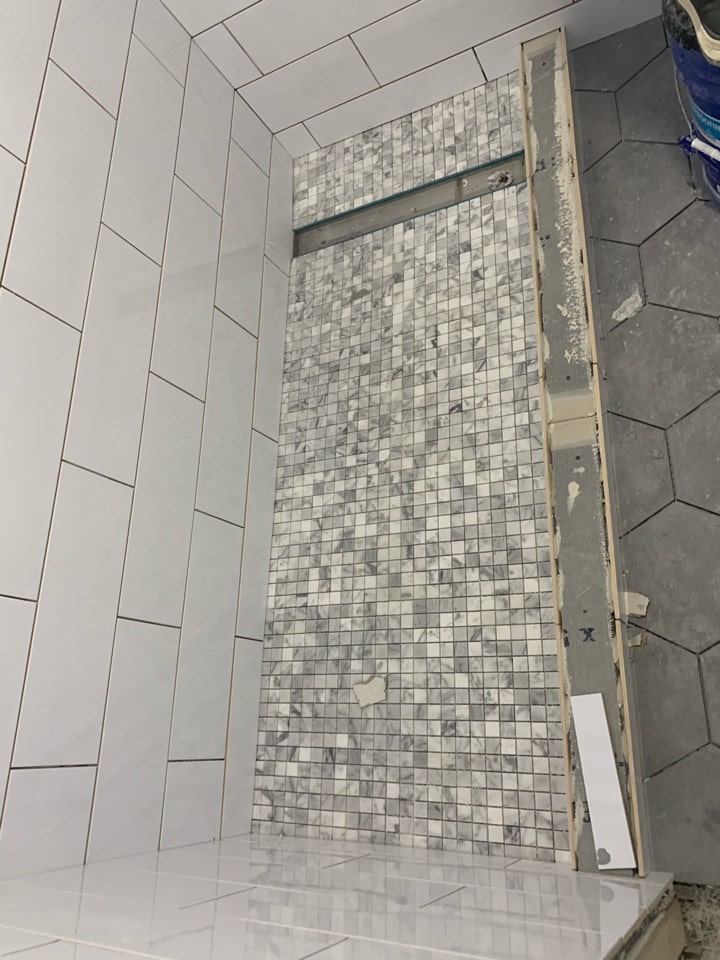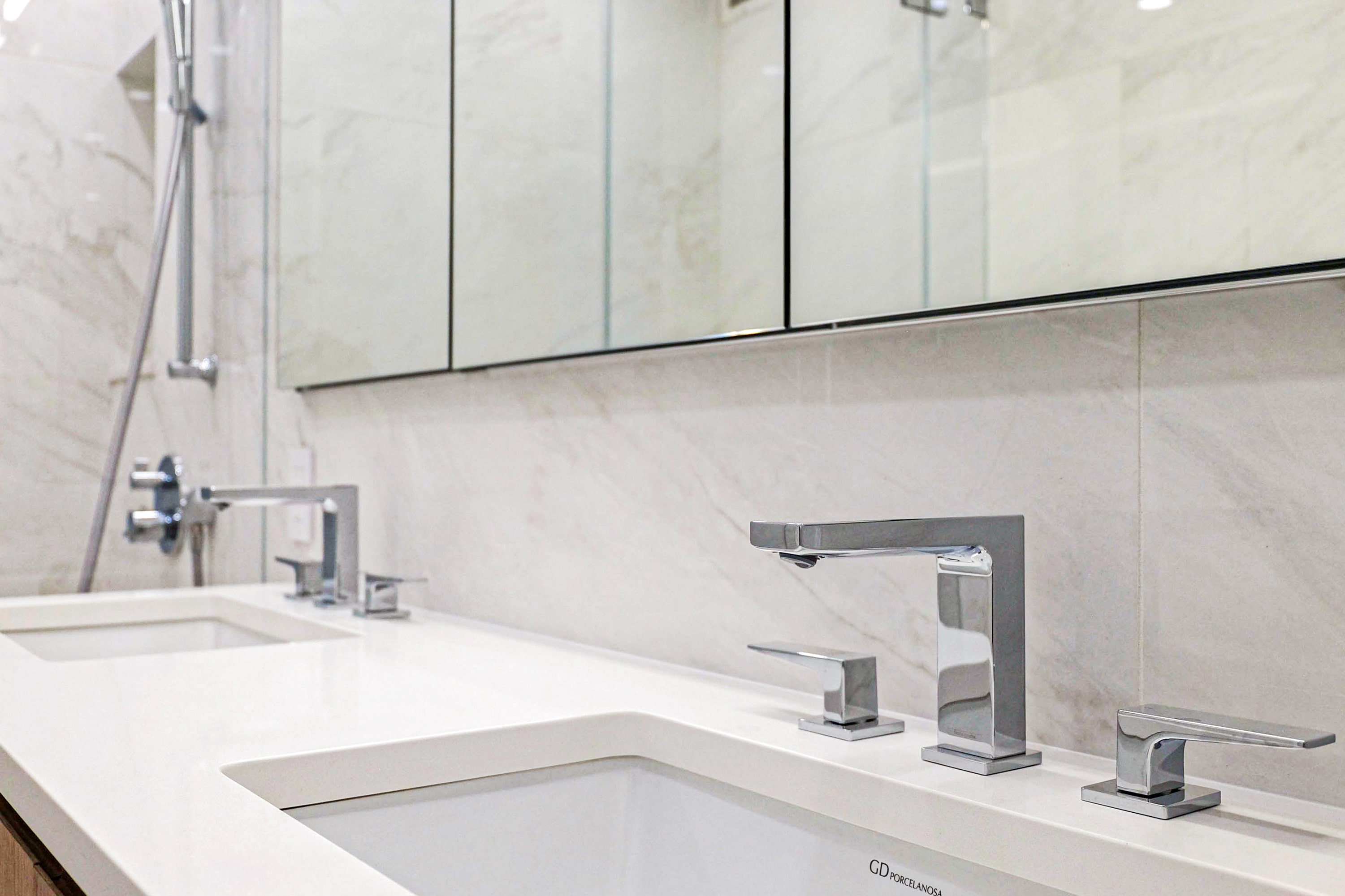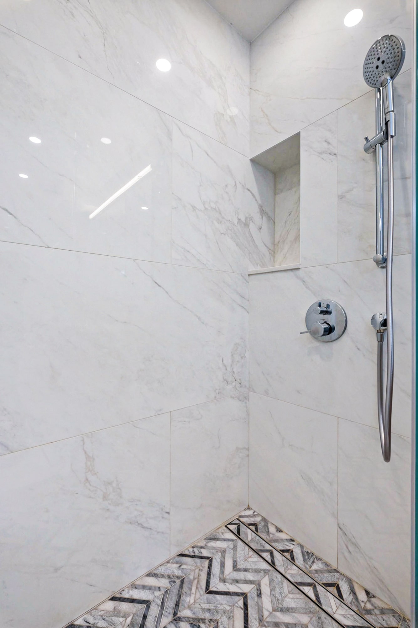 In the main bathroom, we custom-cut the oversized porcelain tiles, which we then juxtaposed with an intricate Amsterdam Chevron White mosaic pattern on the floor of the new walk-in shower. The double vanity balances out the immaculate but inviting master bathroom design with an organic touch from the natural wood.