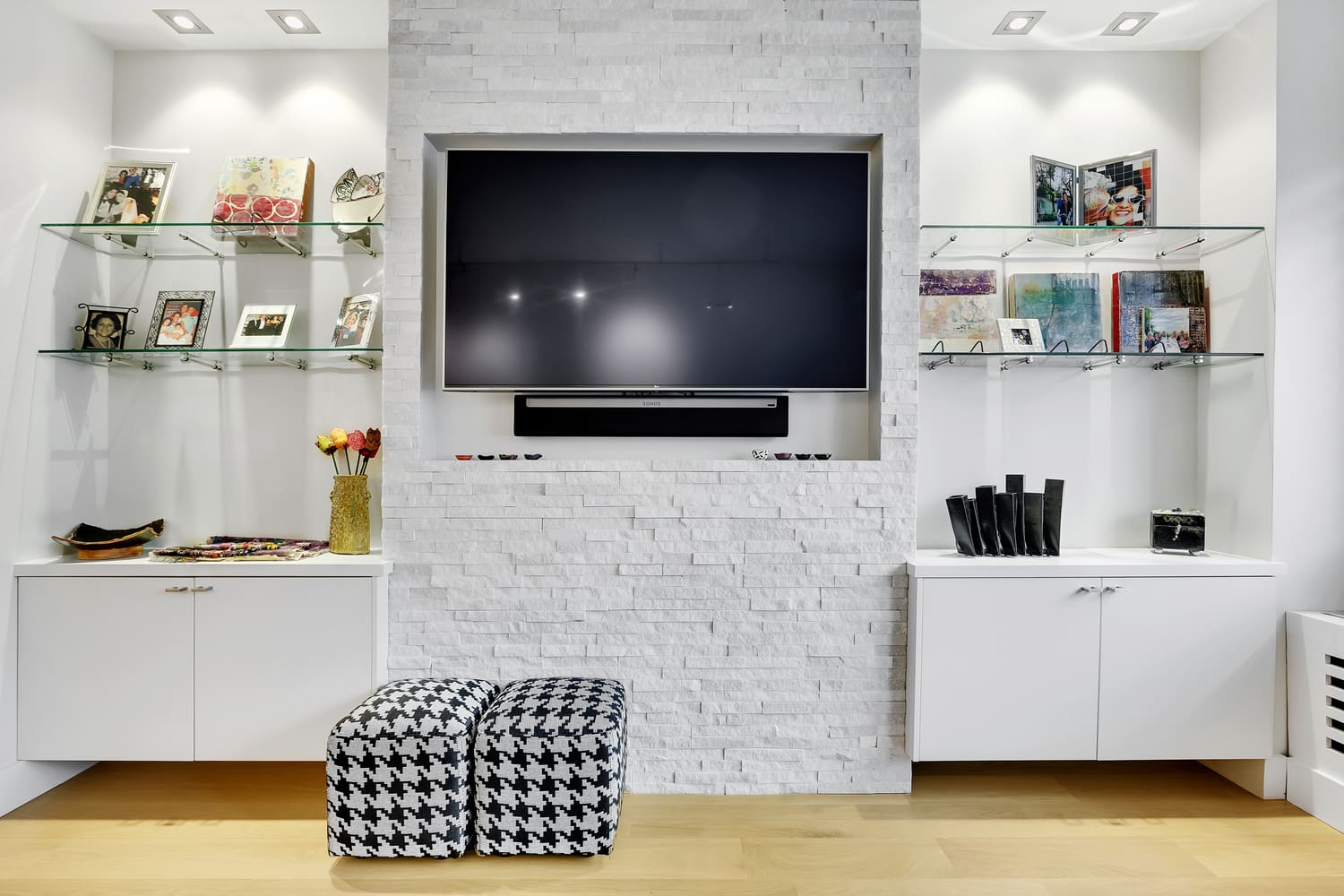 One of the clients is an artist and wanted wall space to display their original work, visible in the dining area and powder room in the photos below. The entertainment center is another highlight of this NYC apartment renovation, with its white mosaic brick tile accent wall and glass open shelves to display family photos on both sides.