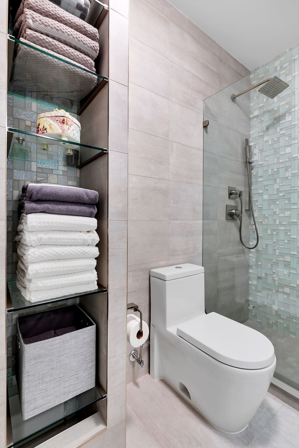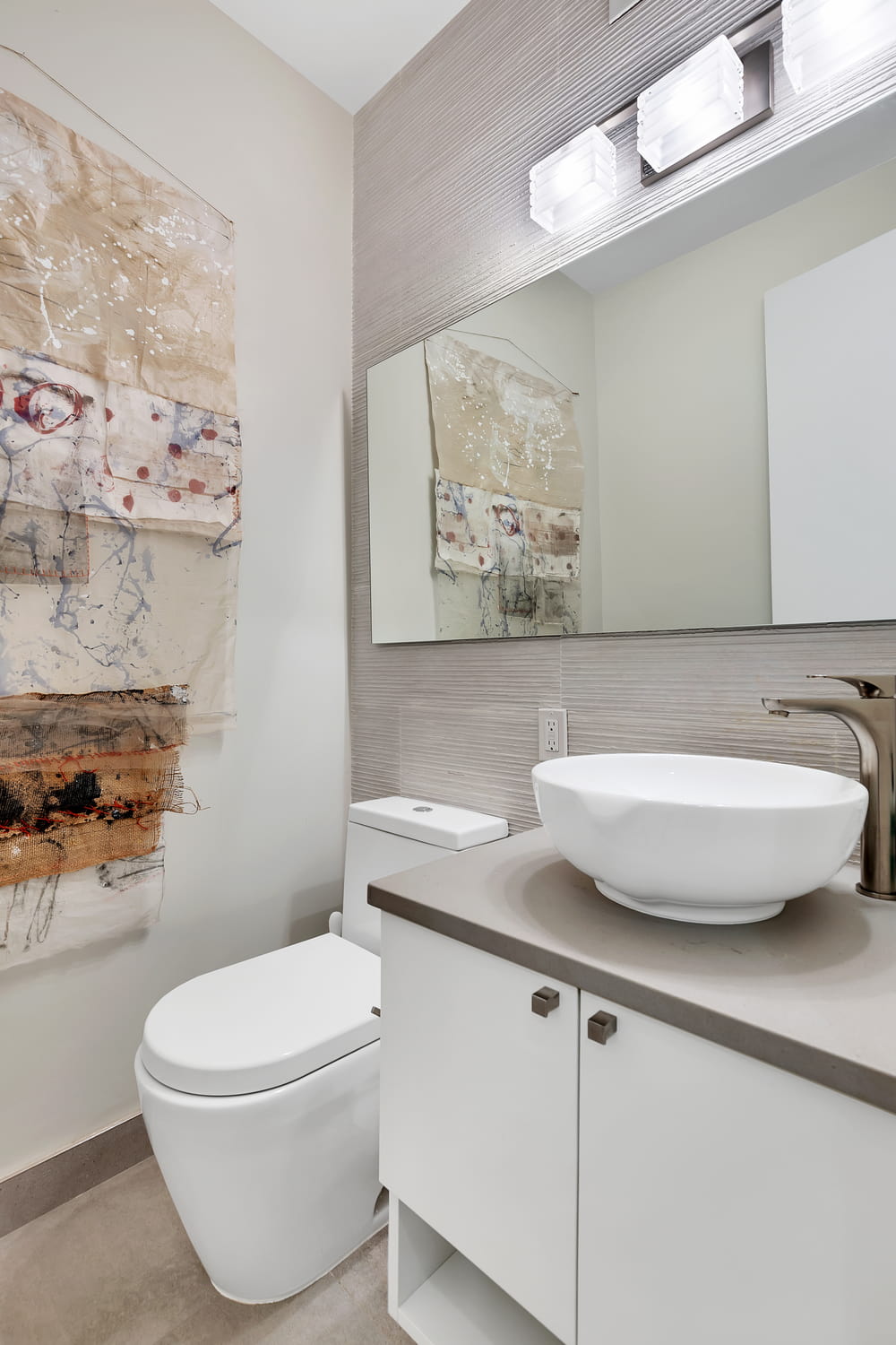 Instead of tiles, the new powder room walls received a textured concrete application, resulting in an almost industrial vibe. In the master bathroom renovation, glass mosaic tile accent walls bring a touch of personality to both the shower and a storage nook opposite the vanity.