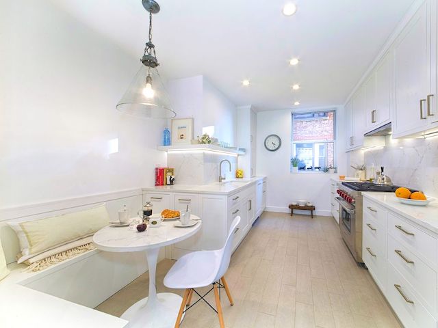 The transitional aesthetic, which pairs classic choices with modern touches, is ideal for pre-war apartment renovations. In this kitchen renovation, in-set Shaker-style cabinets open and close flush with the frame instead of over it, a design feature of pre-war English-style kitchens. The champagne-colored pull handles offer a contemporary sense of contrast, while the matching quartz countertops and backsplash pull the look together.