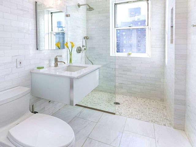We also updated two bathrooms in this Manhattan pre-war apartment renovation. The shimmering modern subway tiles bring a timeless New York City sensibility, while the glass-paned shower and floating double vanity creates a spa-like atmosphere in one bathroom. In the other, large marble tiles visually animate the main floor, while penny tiles offer smaller-scale contrast in the shower.