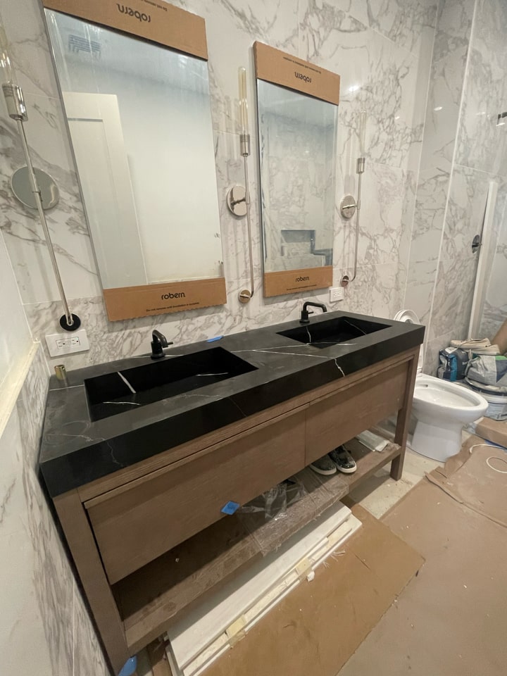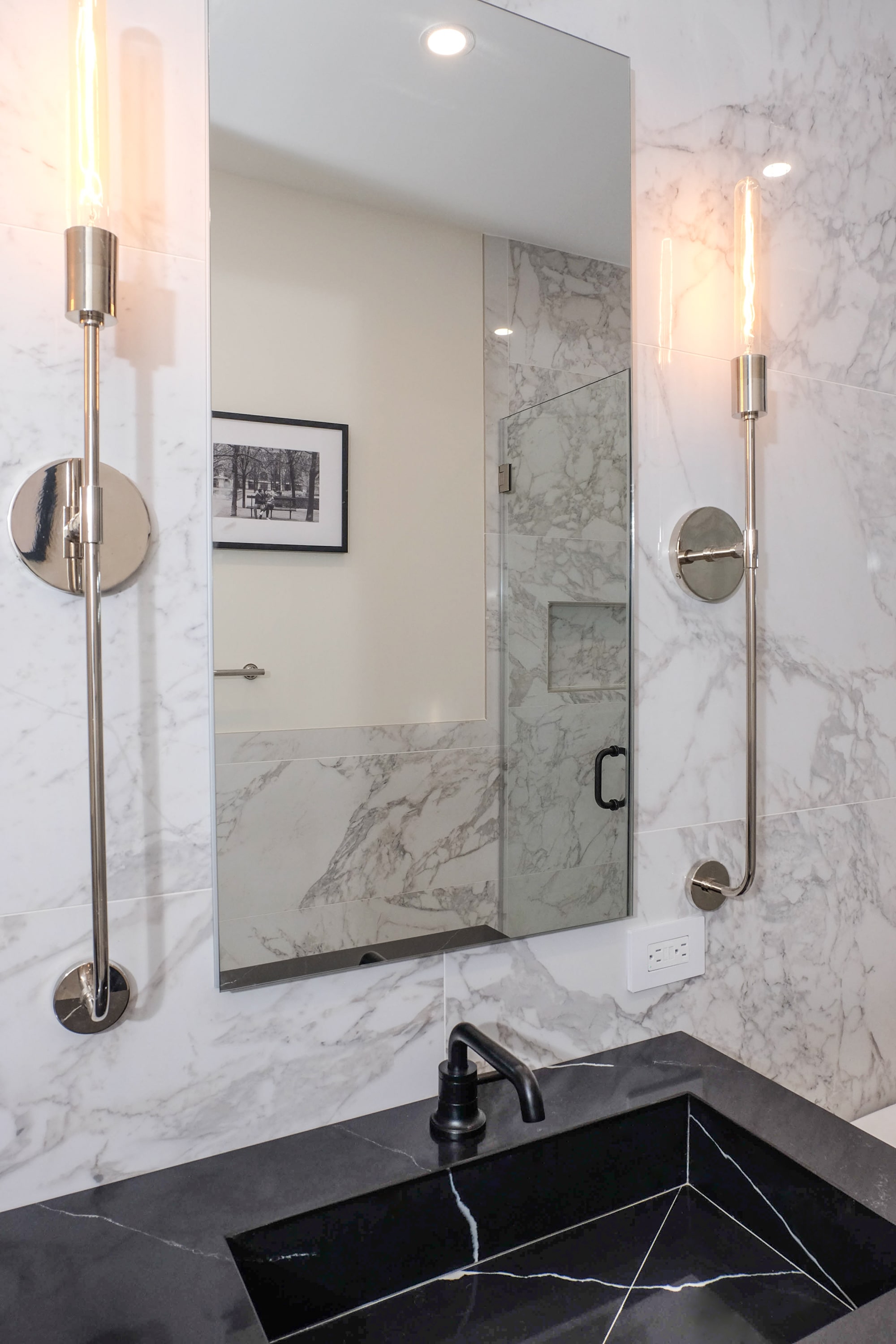 Our plan called for three bathrooms, but the two apartments combined only had one each, so we created an additional powder room which didn’t exist. That new powder room has an evergreen floral print wallpaper and Barclay Vessel stone sink, providing an organic, inviting feeling for the space, which will ultimately be used as a kids bathroom. The other two bathrooms are more high-end, with endless Dolomiti Pulido porcelain tile throughout the master bath and Paradise white penny-tile in the guest bath. Each space conveys a unique look and feel.