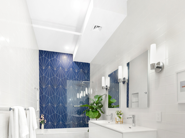 Three bathrooms were totally overhauled in this Brooklyn condo renovation, with varying emphases on playful and classic throughout all. Blue is a bold accent color in two of the bathrooms, softened by a floating white vanity, white subway tile, and wall-mounted toilet in the one. In the powder room, an accent wall featuring ceramic tiles in Deep Blue makes a colorful statement.