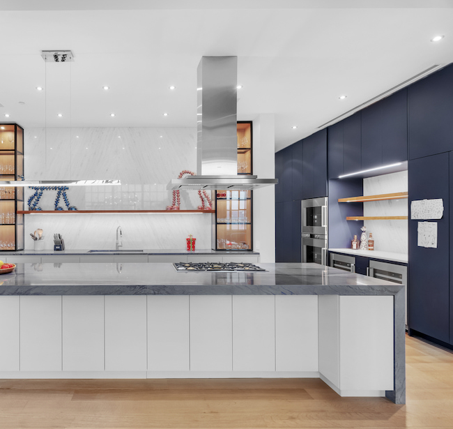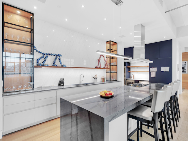 Color was an important design element in this Manhattan kitchen renovation. This is evident in the striking blues and grays of the marble countertops and backsplash, as well as the dark navy hue of the built-in cabinets. White lower cabinets create two-tone contrast, while glass cabinets and a long wood open shelf make the most of the available height.