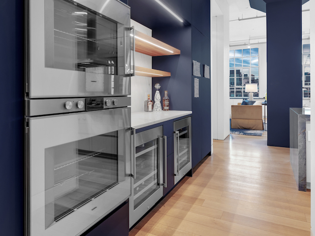 The built-in cabinets also include built-in appliances: an espresso maker, coffee machine, two side-by-side wine fridges, and even an integrated refrigerator paneled to match the cabinetry for an essentially seamless look. The cabinets are all push-to-open, eliminating knobs to complete the overall sleek, contemporary style.