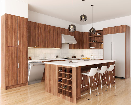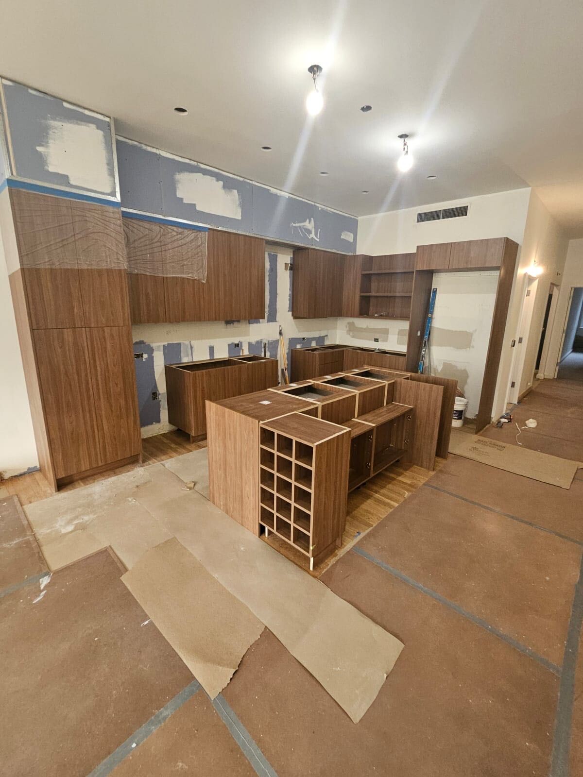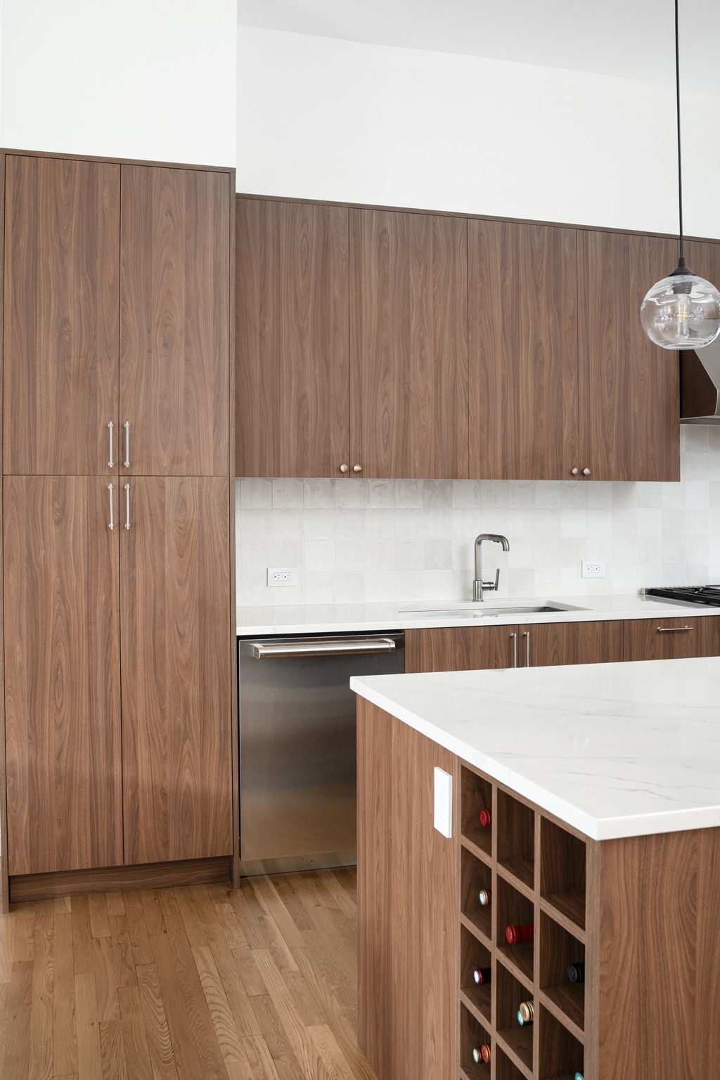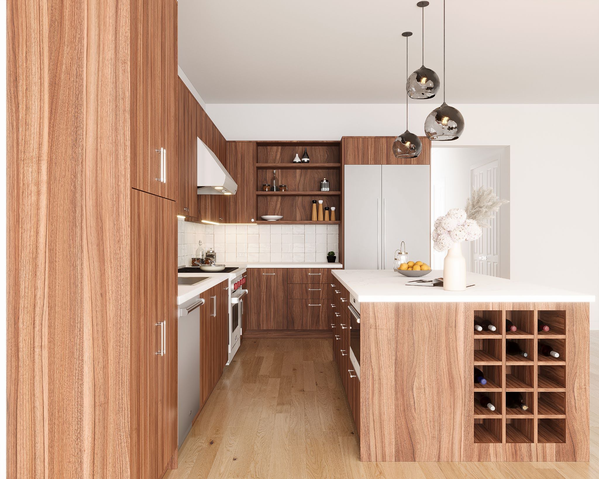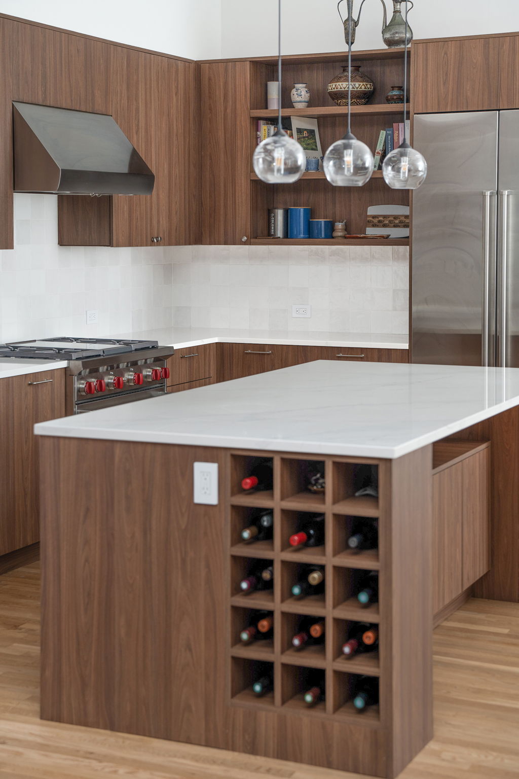 While the design foundation was rooted in mostly light and airy tones to enhance natural light, the full gut renovation required us to blend modern functionality with inviting design, including a kitchen island with an integrated wine rack accommodating 15-30 bottles, alongside oversized countertop space ideal for cooking amidst company. Above is the 3D render we created for our clients prior to build, to help guide the design process. See the final result below.