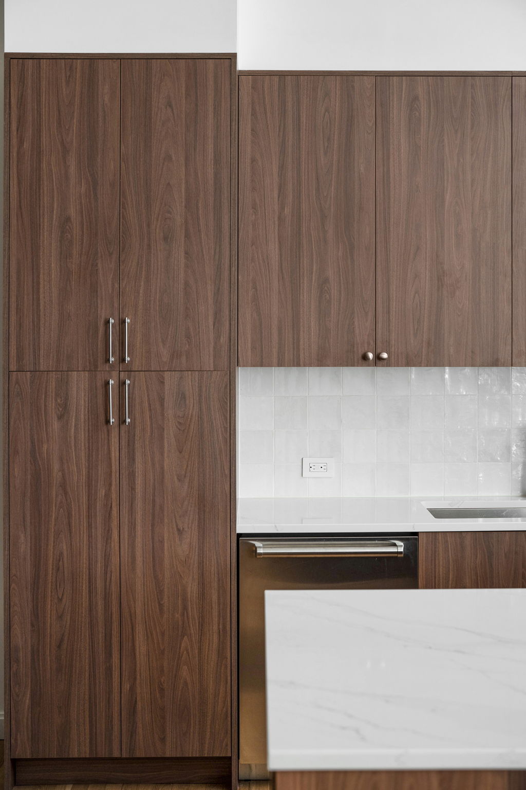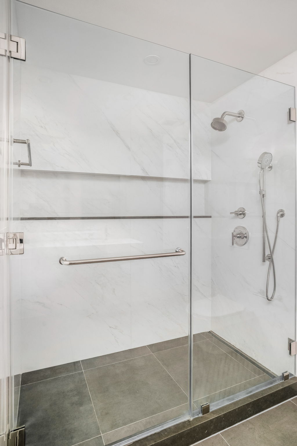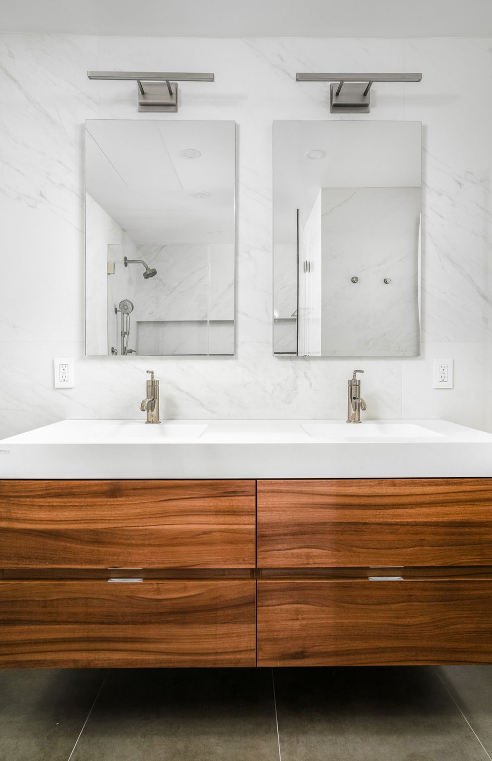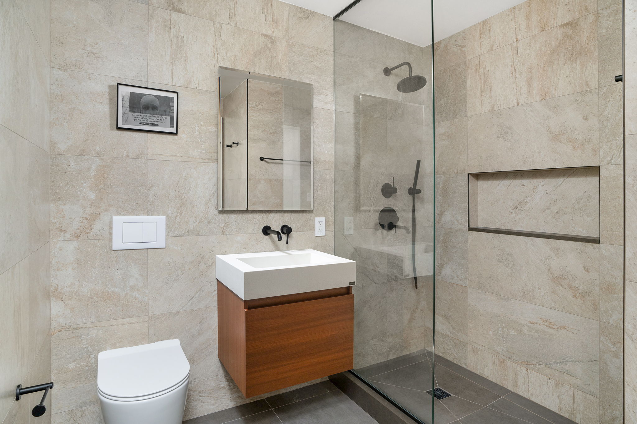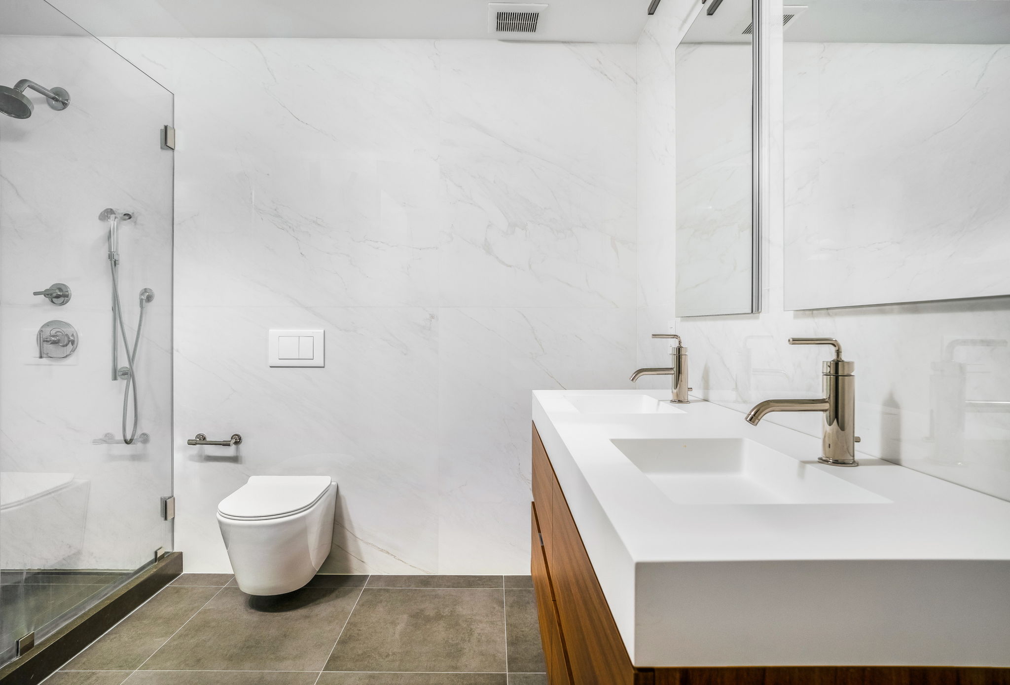 Another key feature of our renovation at 365 Greenwich is the primary bathroom. With a gut renovation required because of the water damage and an opportunity to start from scratch, our clients opted for opulence, stemming from a beautiful walk-in shower, double vanity, and porcelain stone slabs extending to the ceiling. The elegance is emphasized via a sleek walnut vanity from KRION and tankless, wall-mounted lavatory.