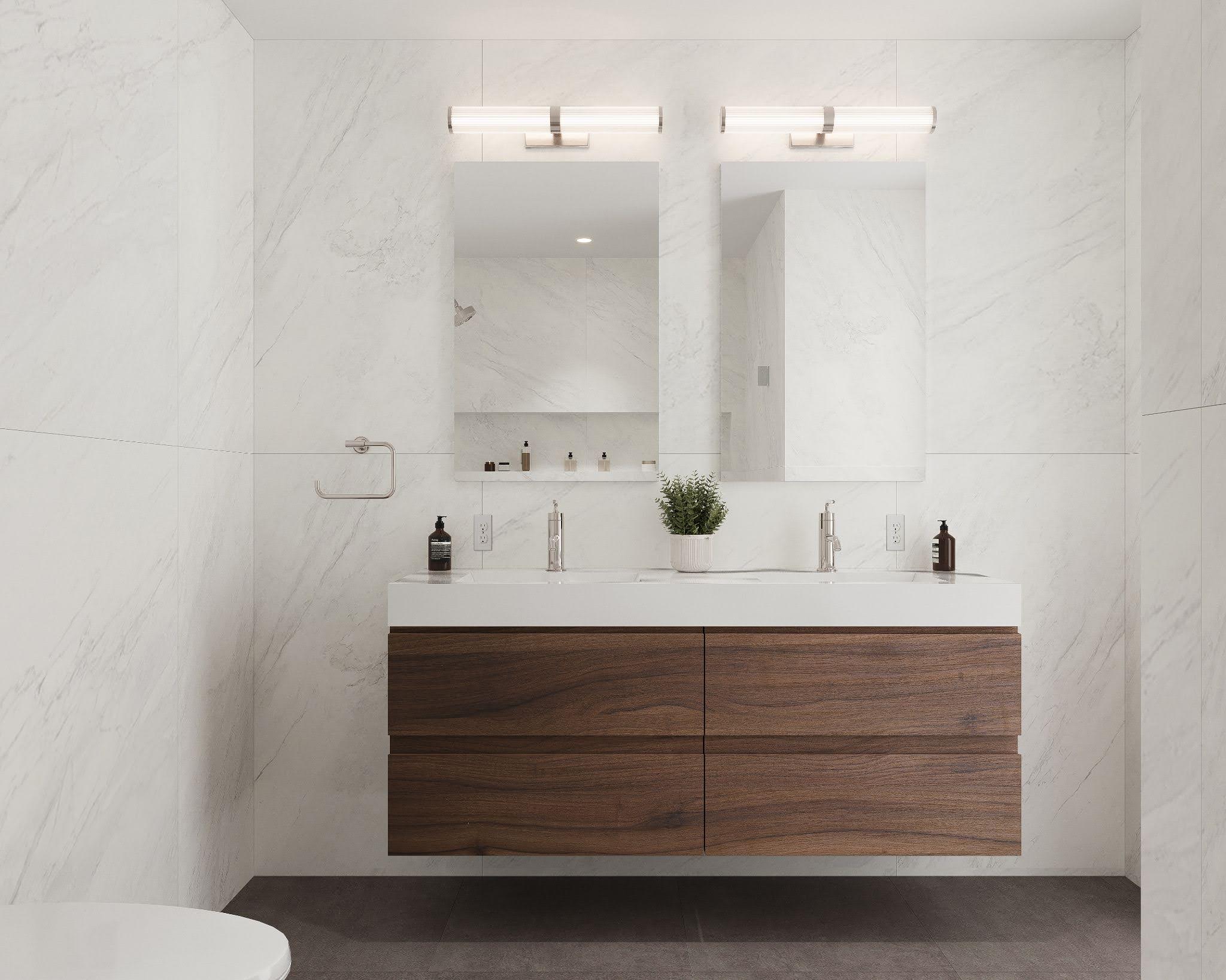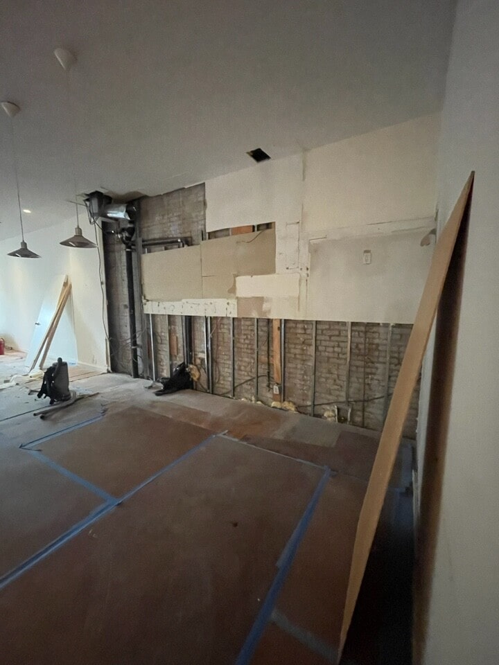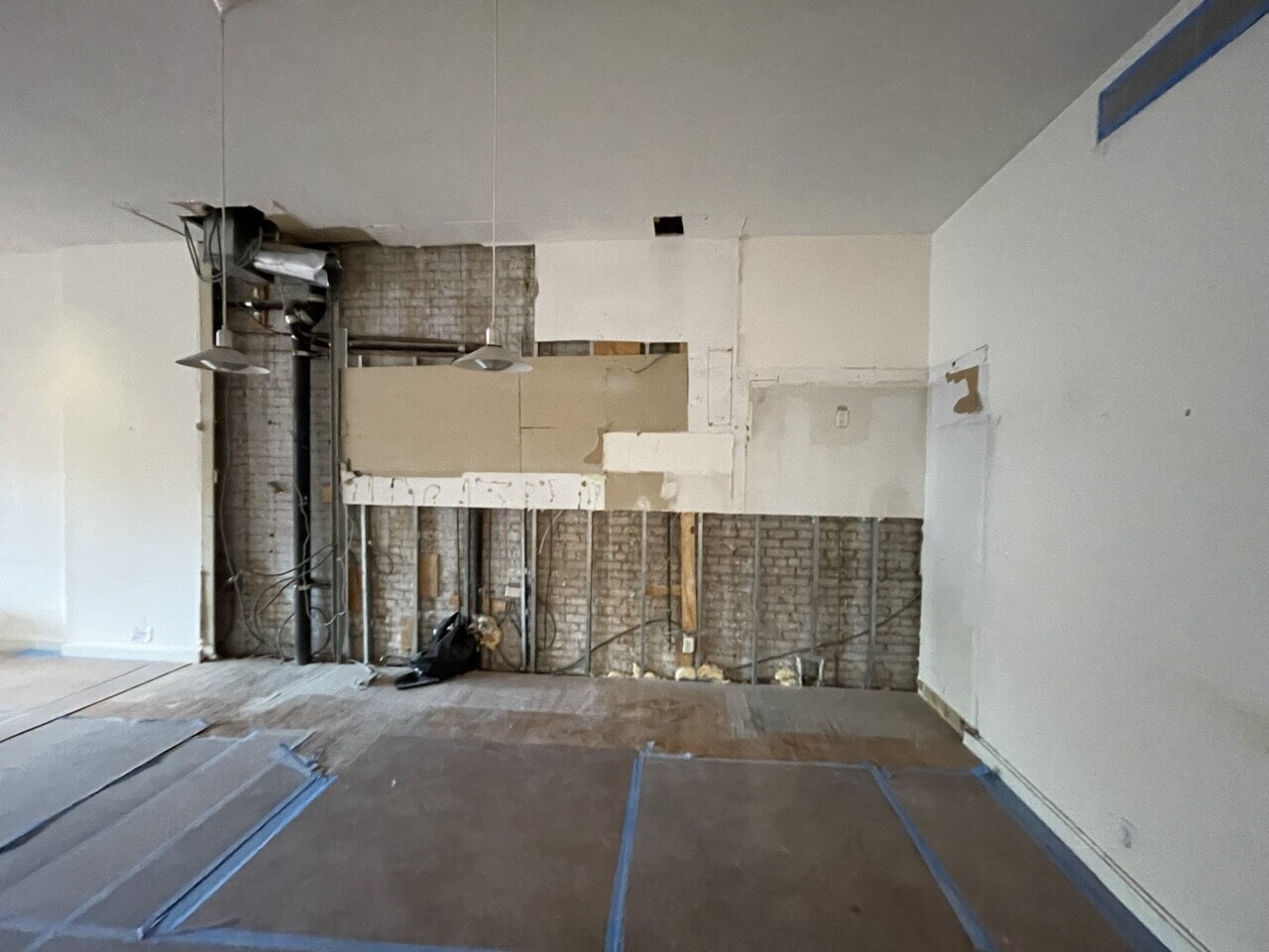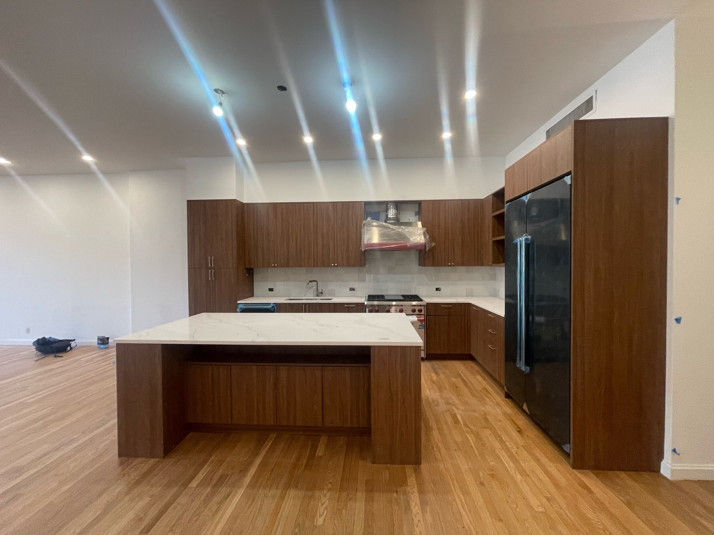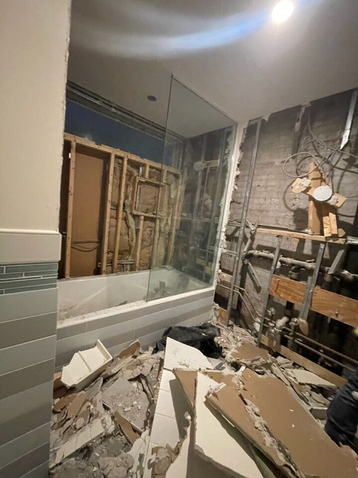 Another key feature of our renovation at 365 Greenwich is the primary bathroom. With a gut renovation required because of the water damage and an opportunity to start from scratch, our clients opted for opulence, stemming from a beautiful walk-in shower, double vanity, and porcelain stone slabs extending to the ceiling. The elegance is emphasized via a sleek walnut vanity from KRION and tankless, wall-mounted lavatory.