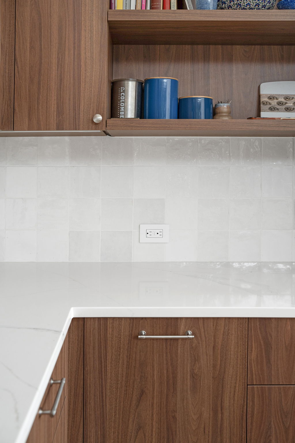 To complement this balance of practicality and style, we selected Amber Drupe cabinets from Miralis, which pair perfectly with the custom backsplash inspired by Portuguese tiles from the family’s travels. This contemporary combination delivers a clean, modern aesthetic with a personal touch.