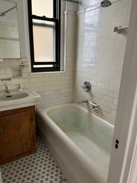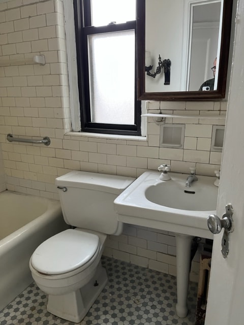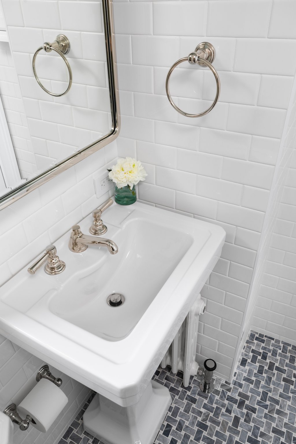 In the guest bathroom, we went for a very similar look to the primary, to honor the design cohesion the original pre-war space offered. We maintained white subway tile on the wall, but swapped in a Bardiglio Gray basketweave mosaic for the flooring, then anchored the period-centric design with a DXV Fitzgerald 24” rectangular fireclay pedestal sink.